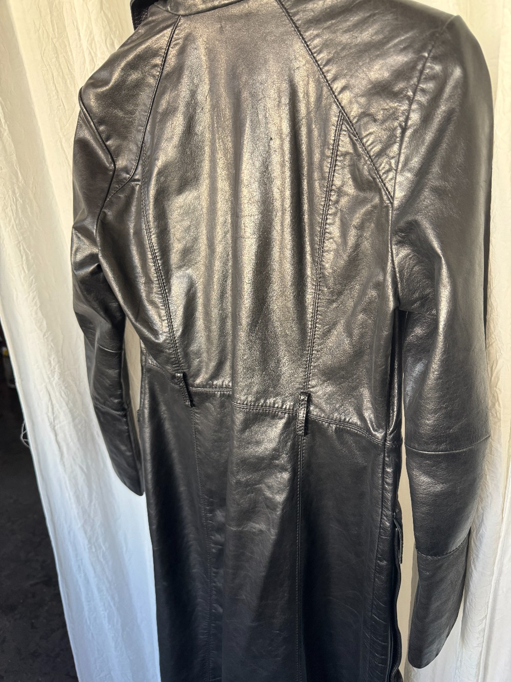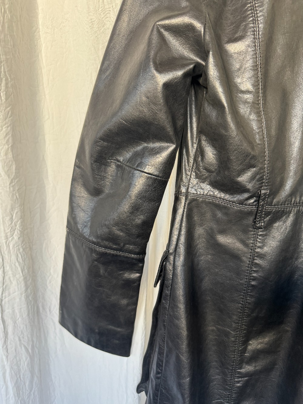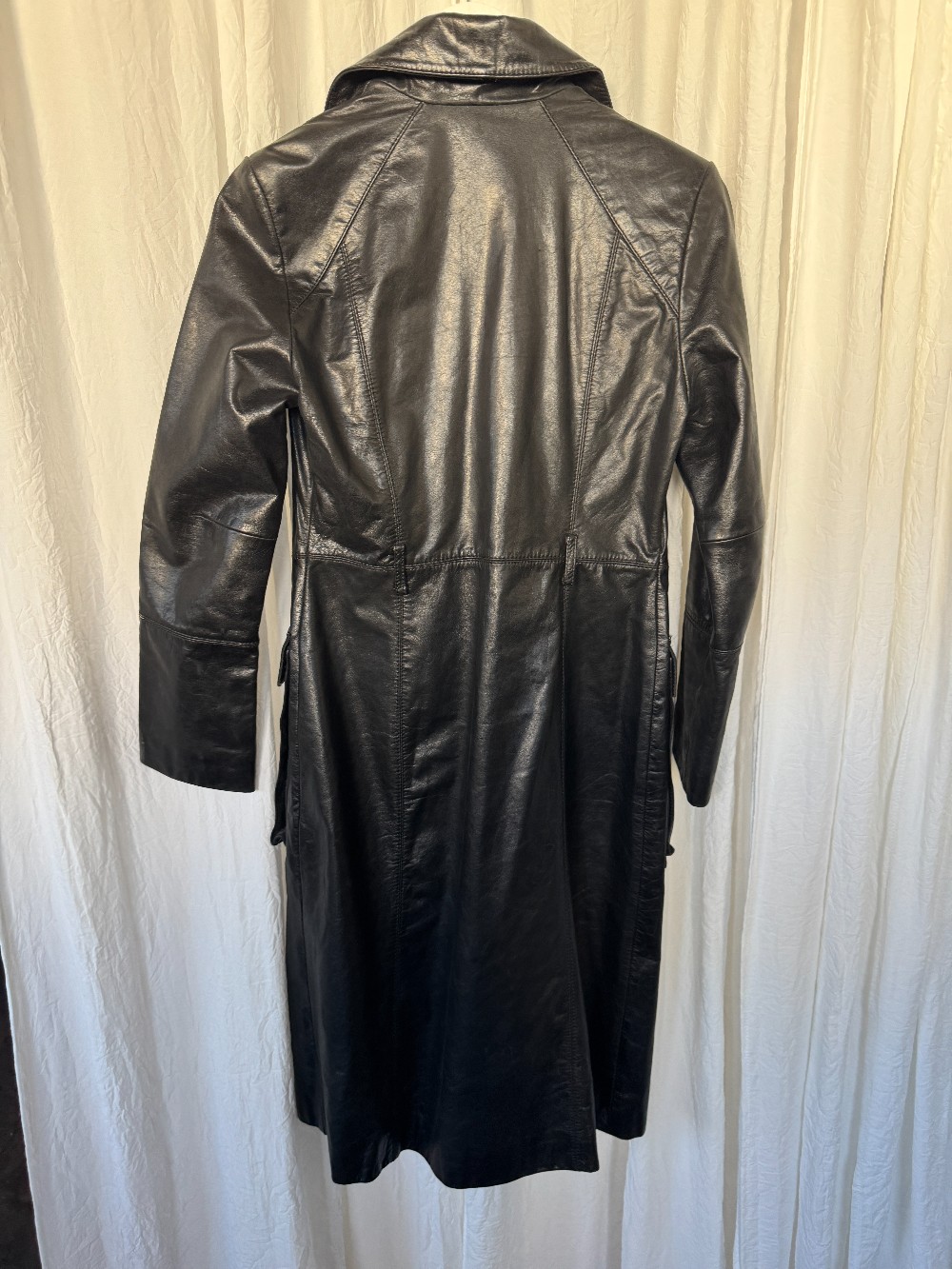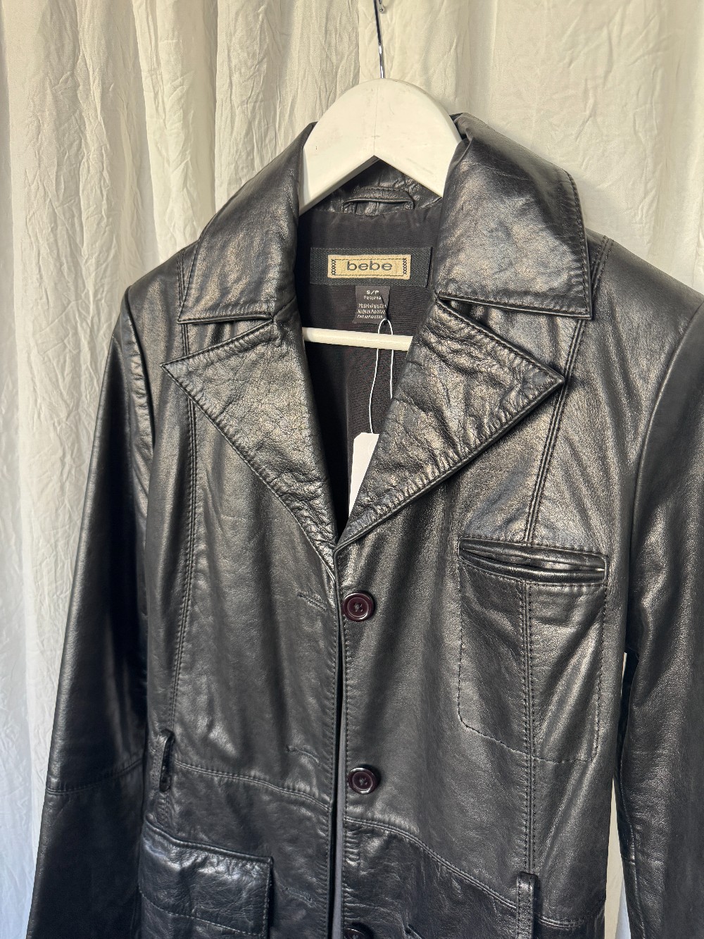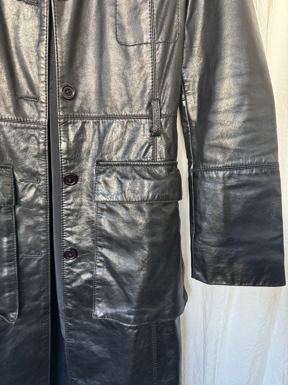 1990s BEBE black leather longline trench coat. button down front. fully lined. oversized pockets.