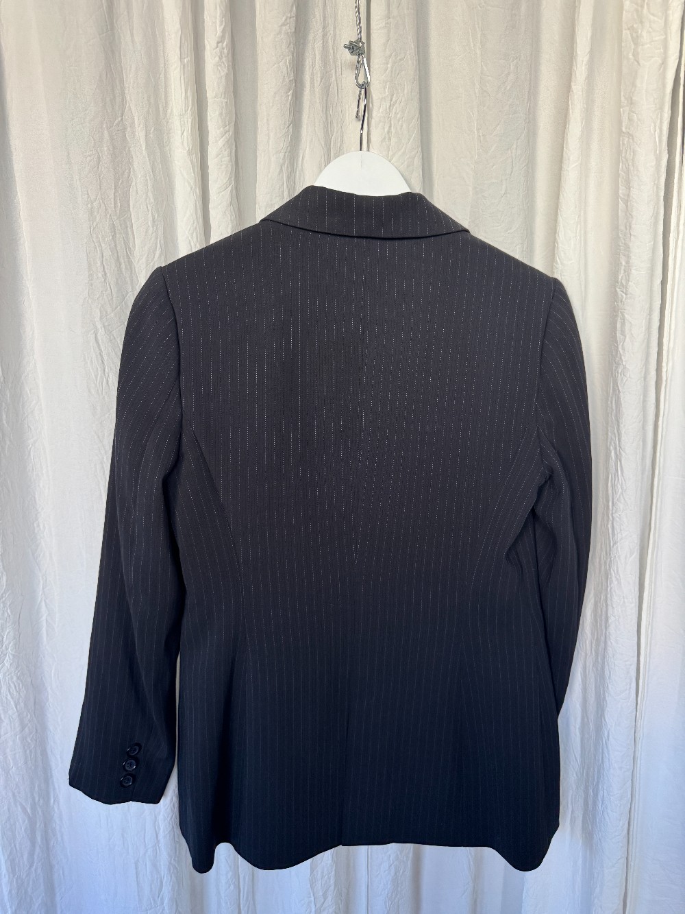1990s GEORGIOU nearly-black navy blue pinstripe suit blazer. two buttons. fully lined.