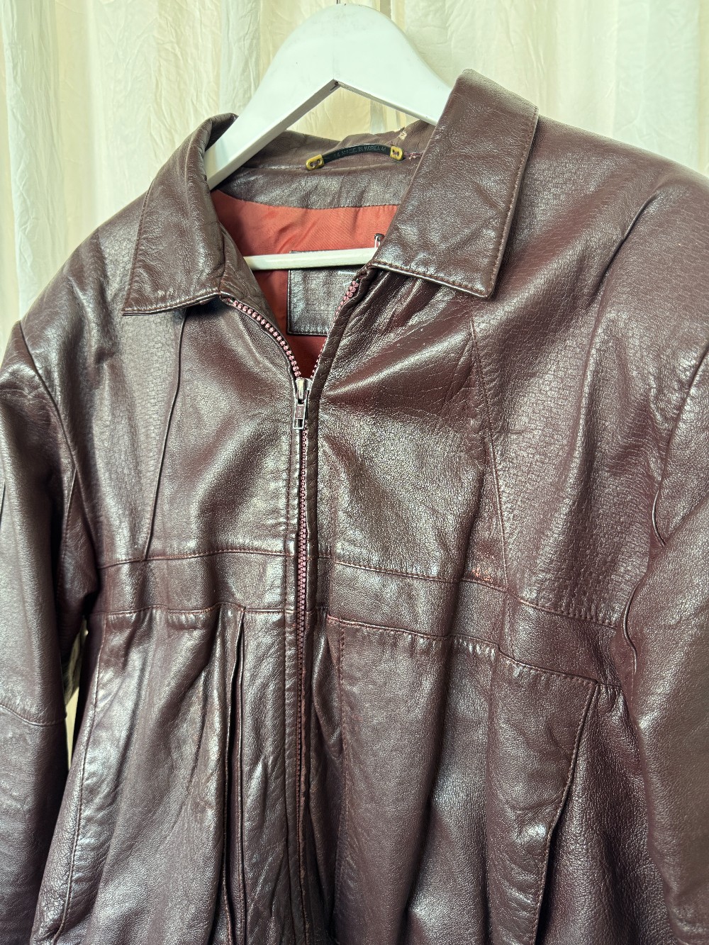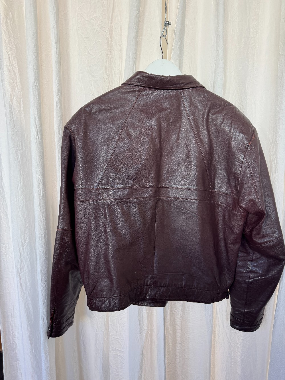 vintage oxblook leather bomber jacket. non-functional pockets. fully lined.