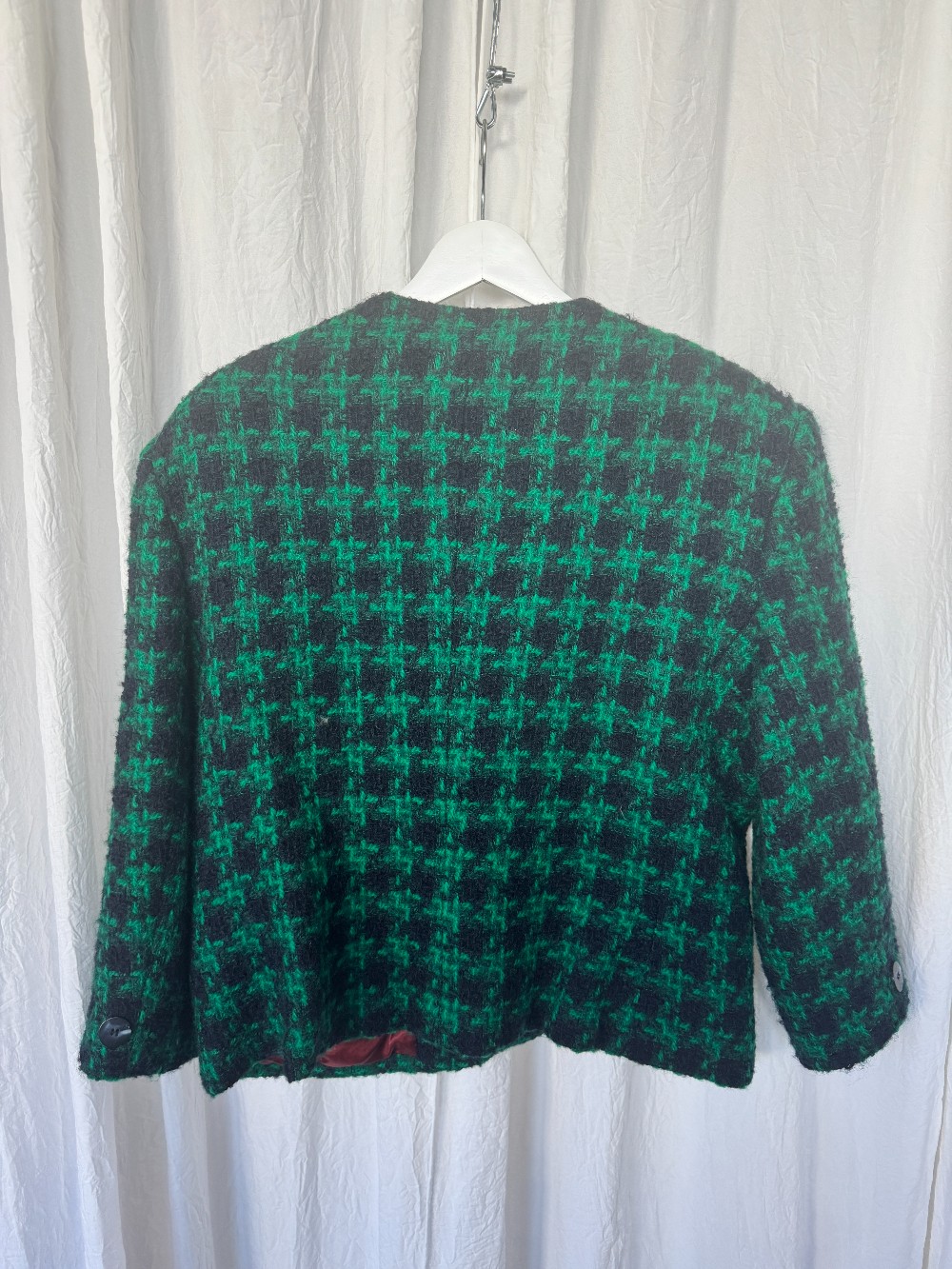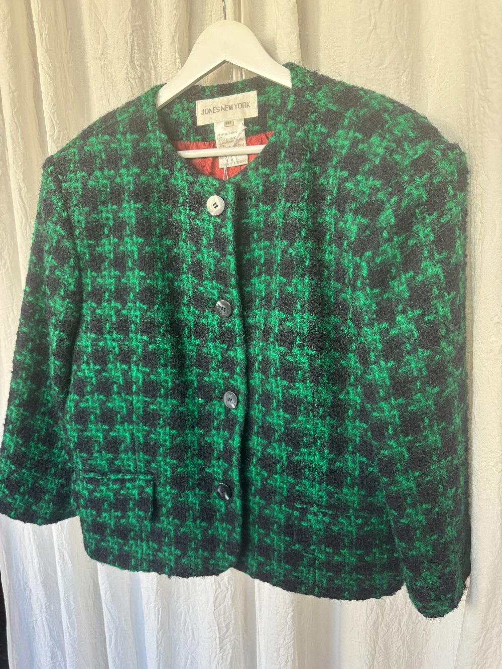 1990s JONES NEW YORK wool navy and green tweed short coat. fully lined. 3/4 sleeves.