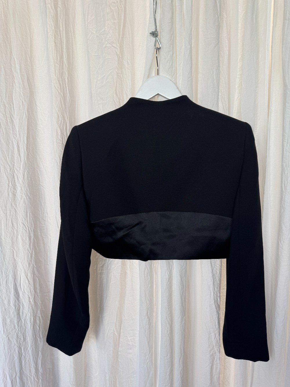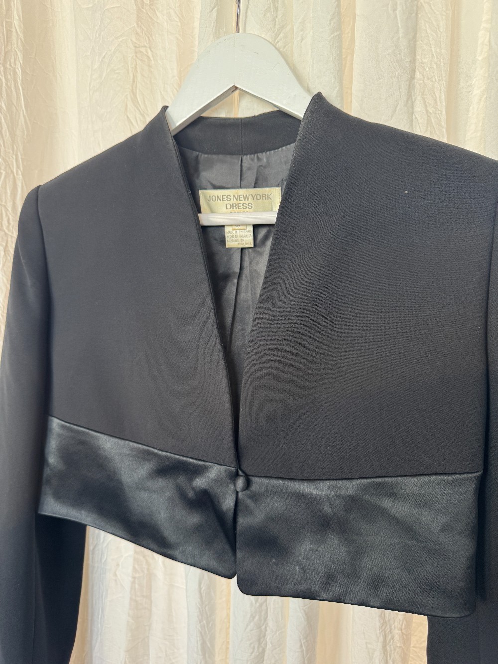 1990s JONES NEW YORK black cropped evening jacket. one satin button closure. high shine satin panel at bottom. fully lined. full length sleeves.
