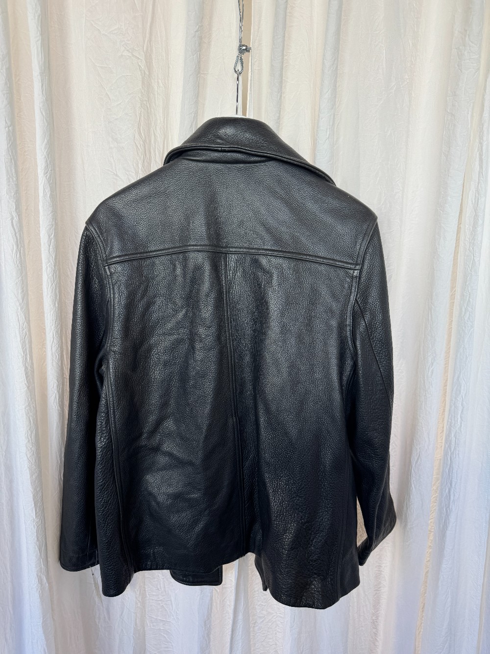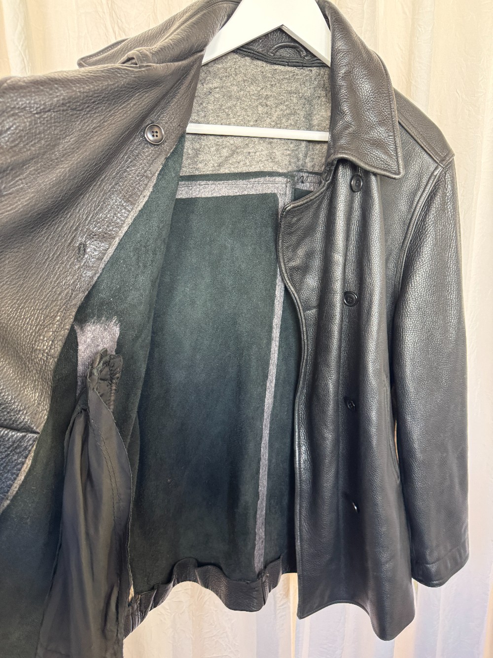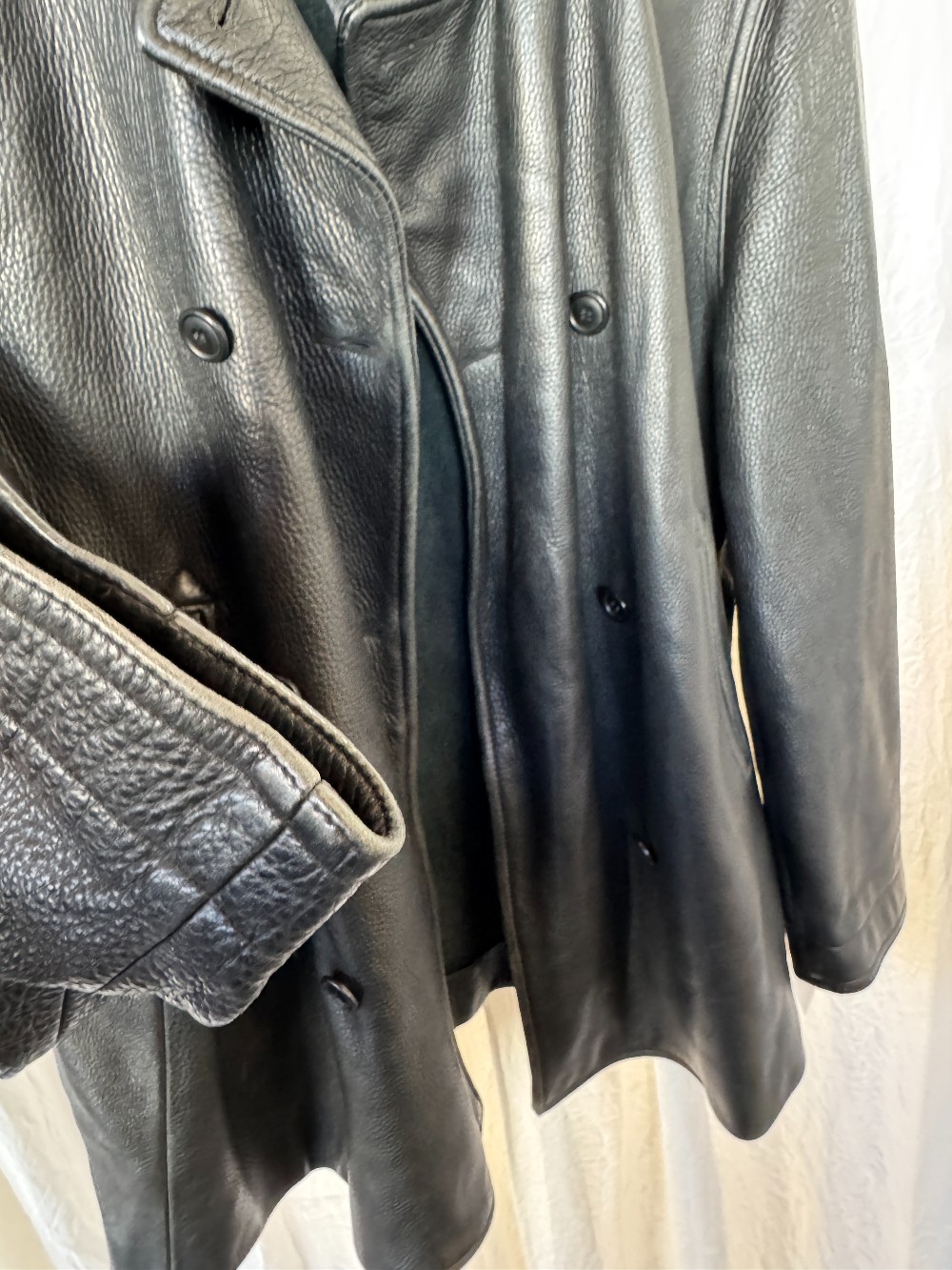 no label. very heavy weight black leather jacket. longline. double breasted. unlined. faux pockets. oversized fit.