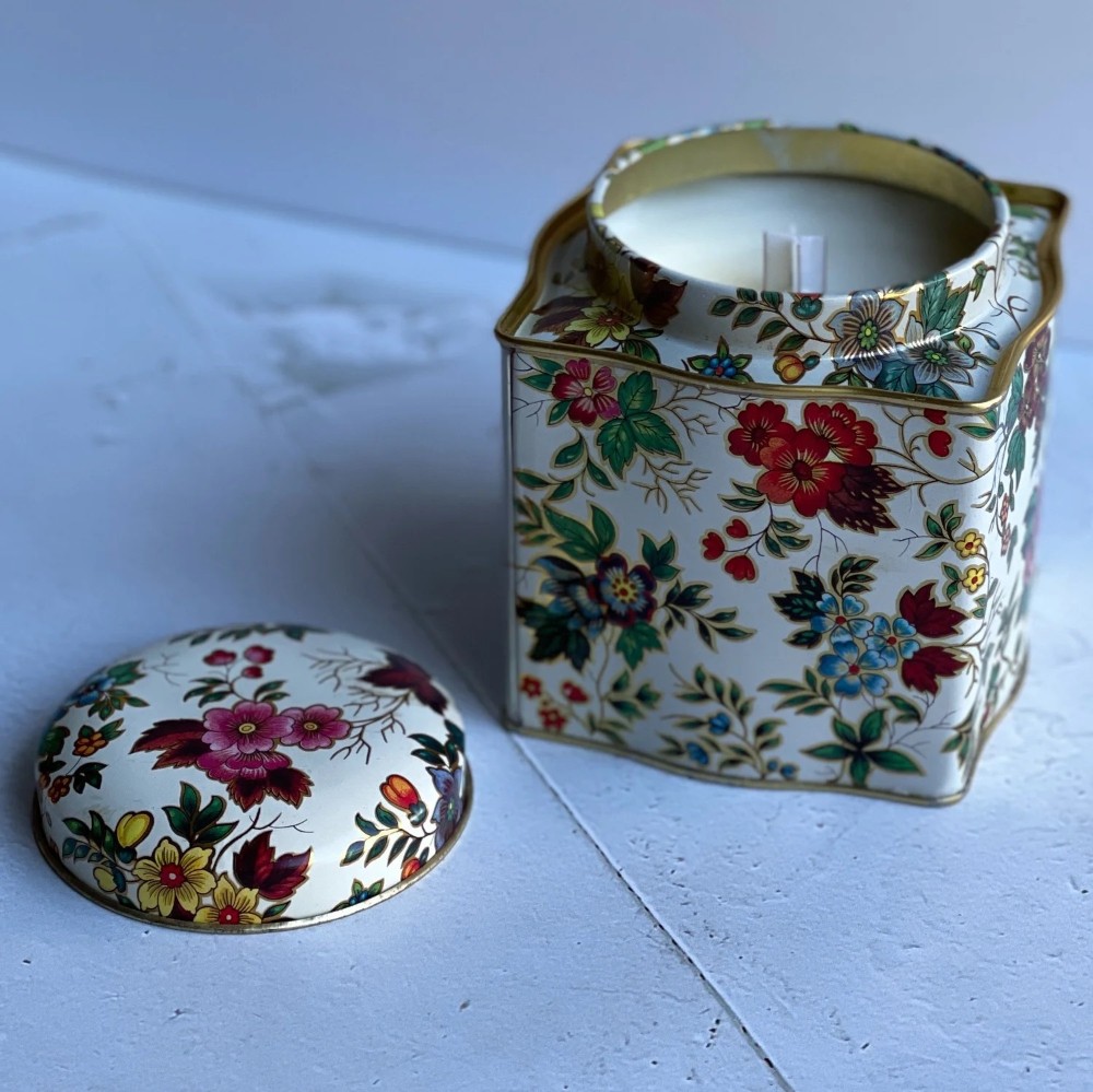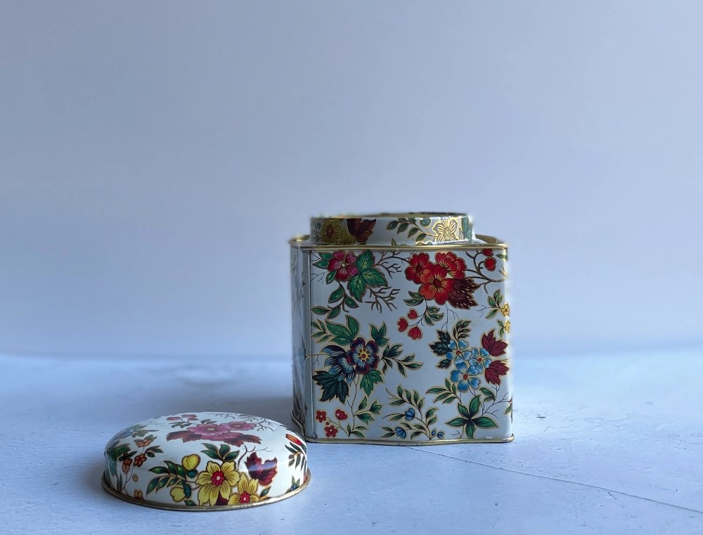 Rehan is a white and floral with gilded details tea tin from 1970s England.