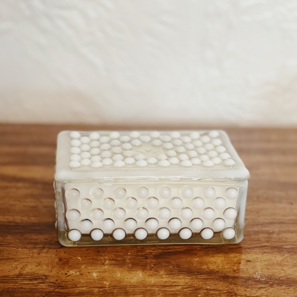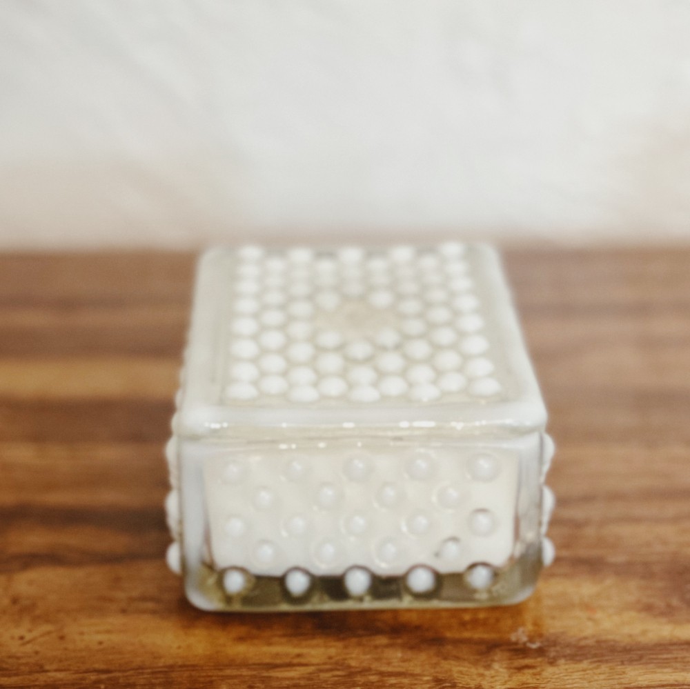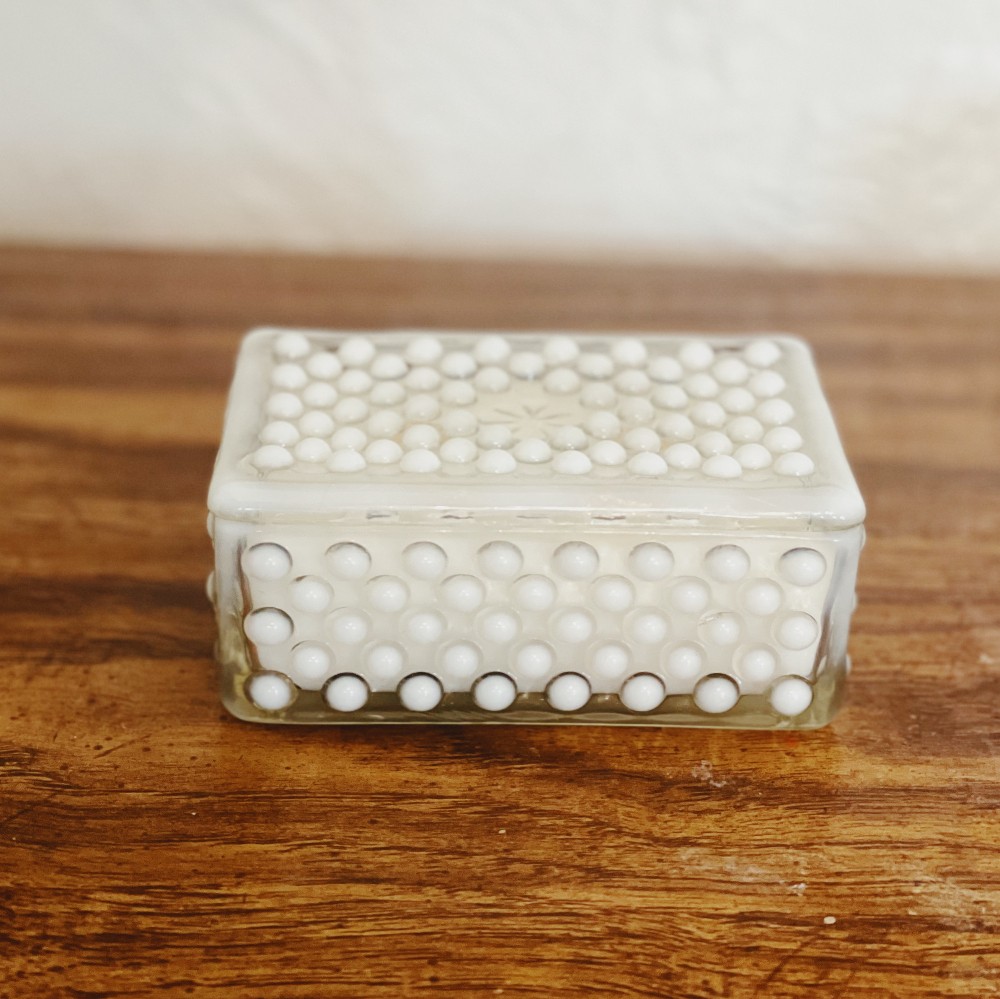 Nune is a super unique white hobnail on glass soap box from the 1960s.
