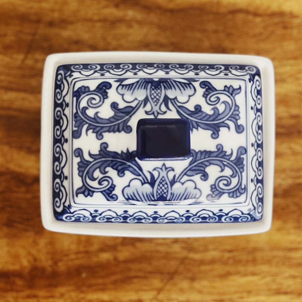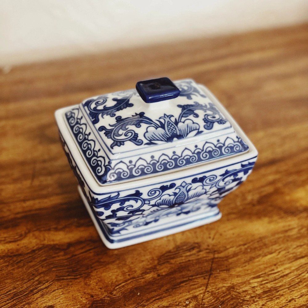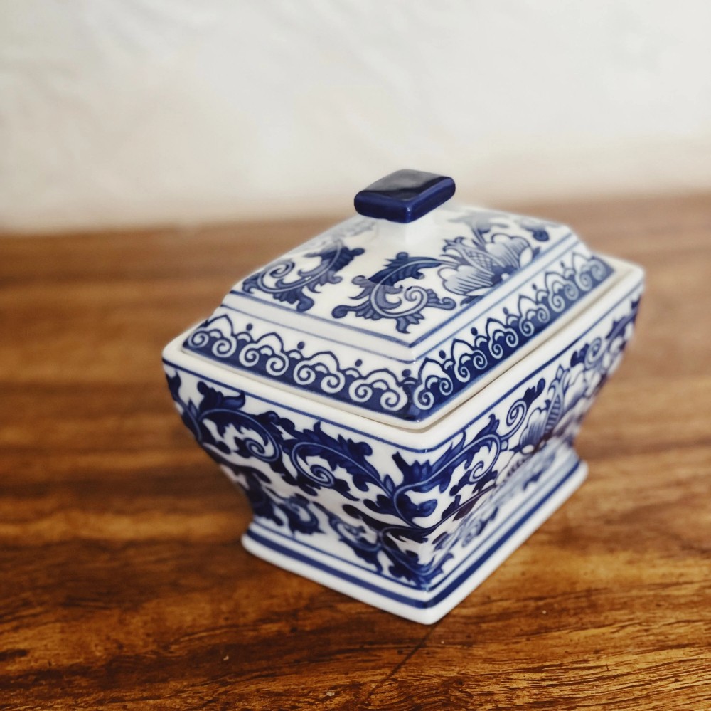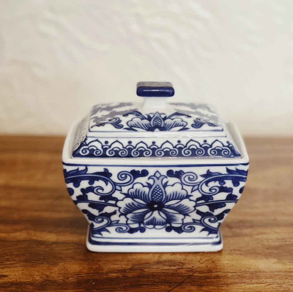 Ankine is a pretty sugar bowl and lid with a blue floral and scroll pattern on a white base.