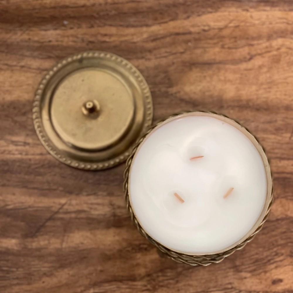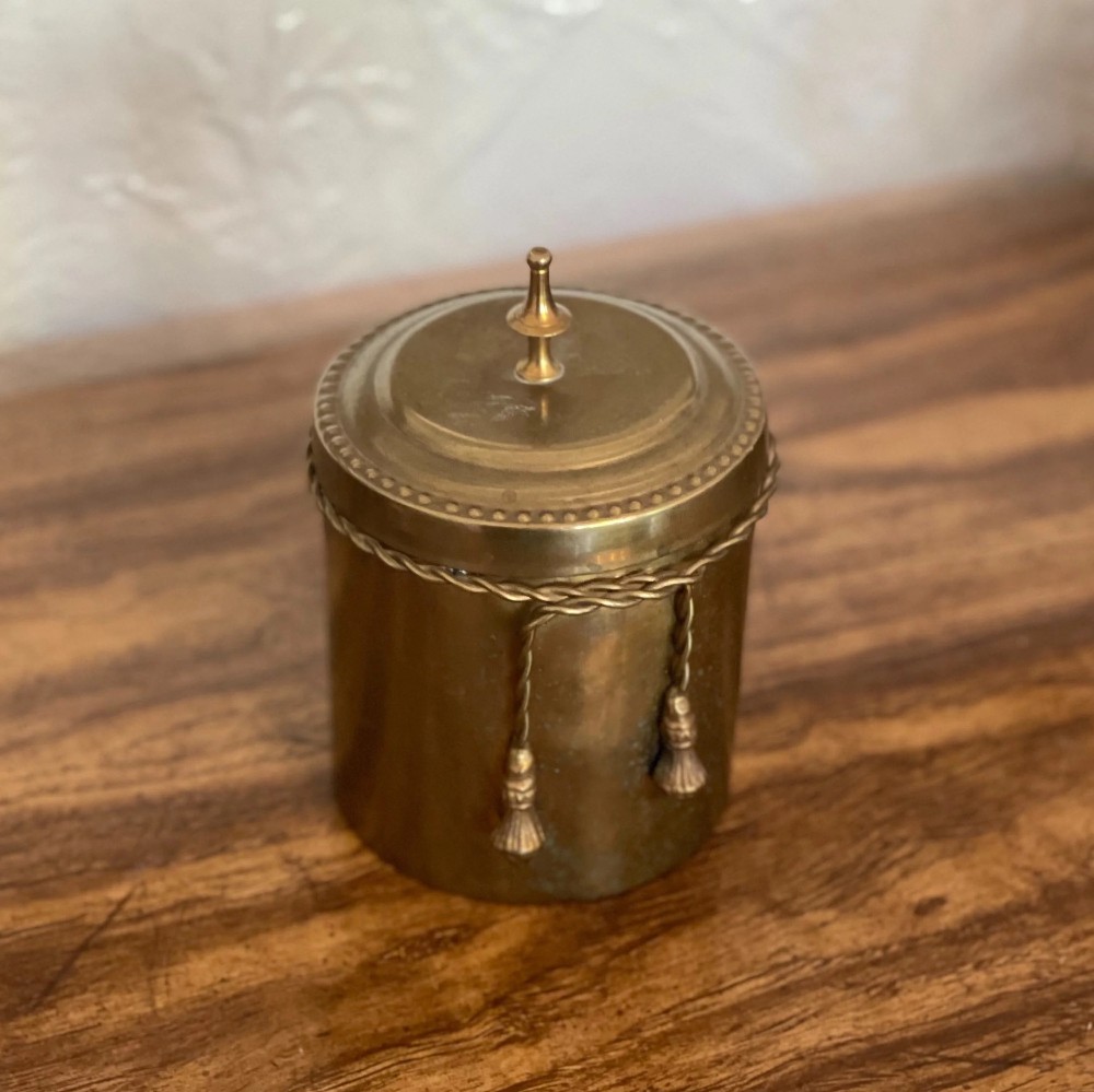 Kohar is brass canister with lid and braided rope detail from the 1970s.