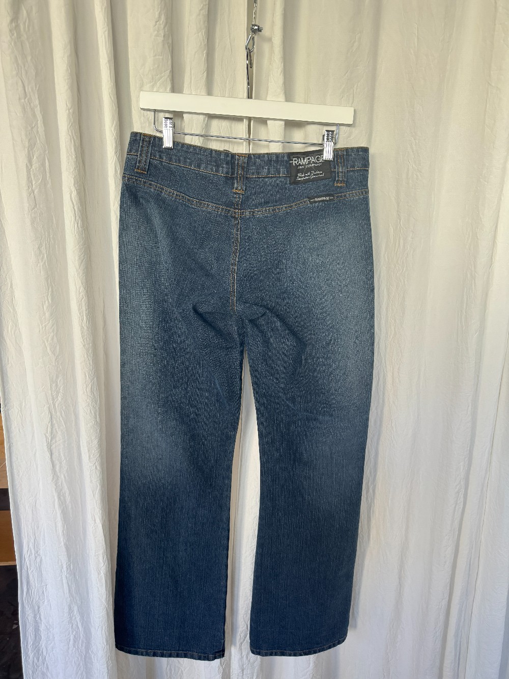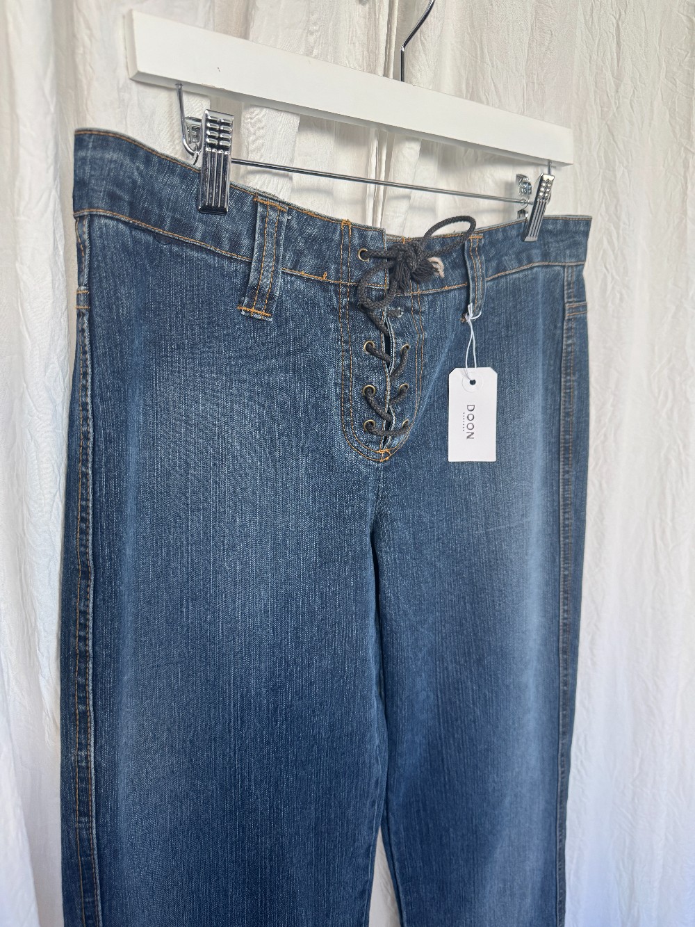 Y2K Rampage dark wash flare denim pants with a lace up and button fly. bootcut style. non-stretch. no pockets.