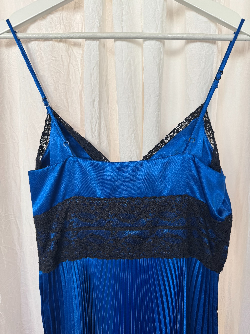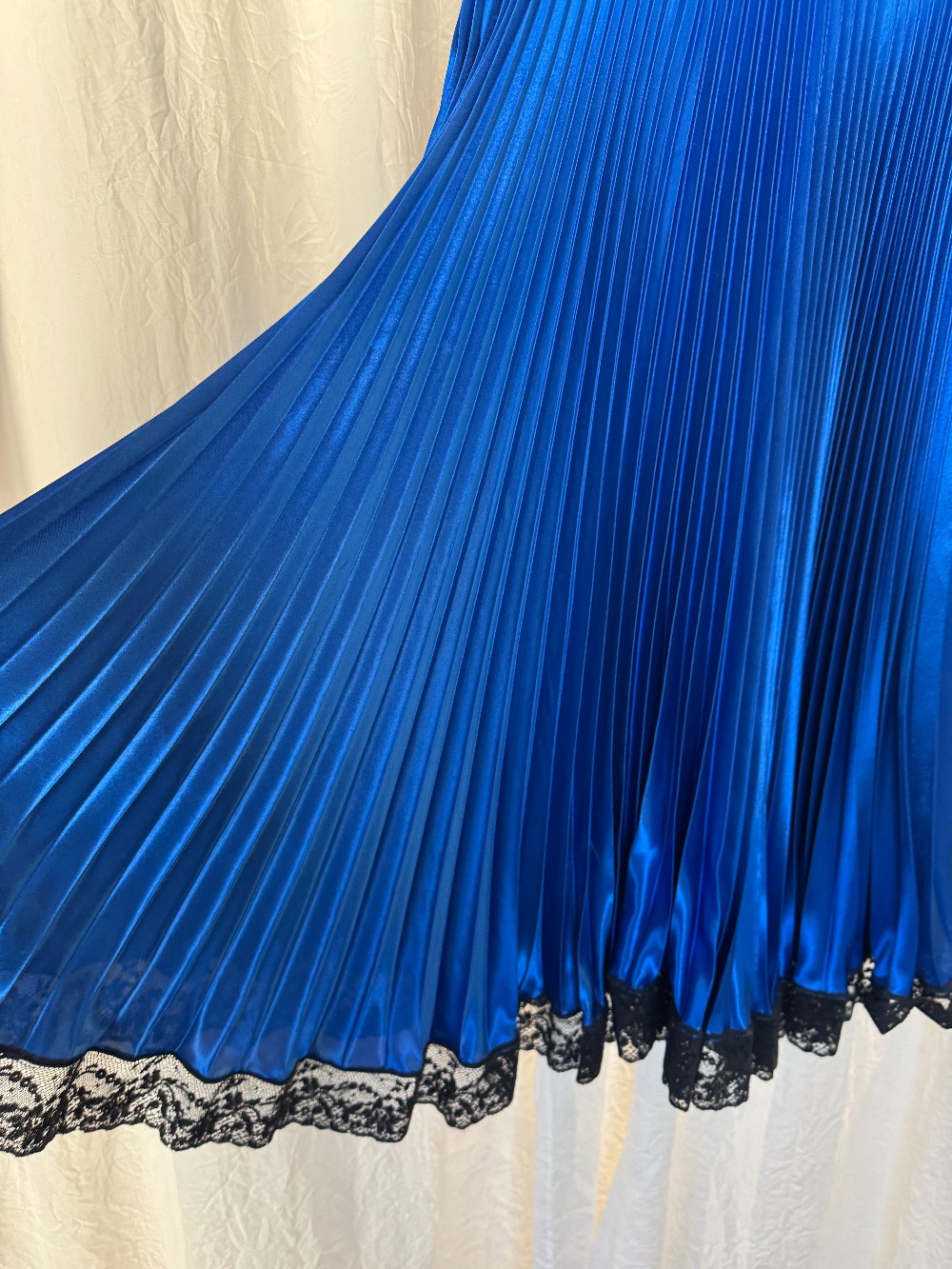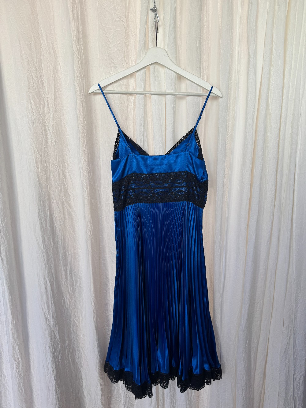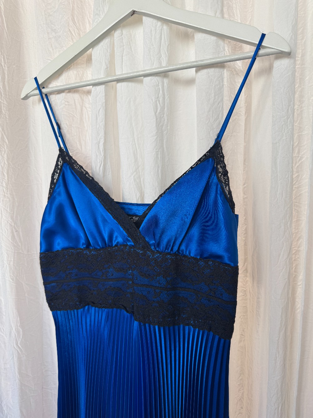 1990S BETSEY JOHNSON black label royal blue midi dress with black lace trim. empire waist. adjustable straps. side zip. non-stretch. rare find!