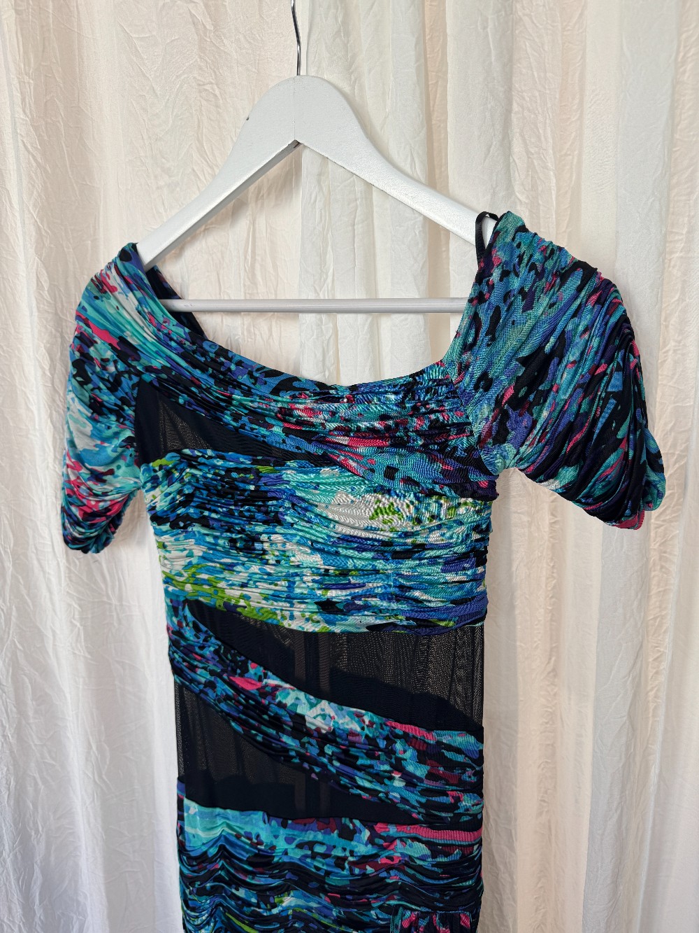 Y2K/2010s BCBG RUNWAY mini dress with sheer and ruched neon abstract print panels. waterfall detail in front. short sleeves. some stretch but great fit! zip up back.