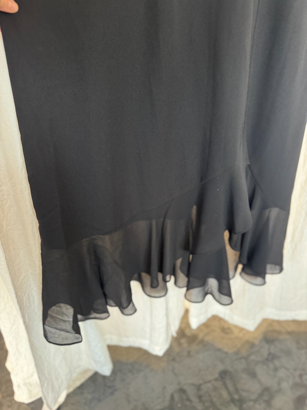 90s JL Studio short sleeve formal black dress with asymmetrical ruffle hem.
