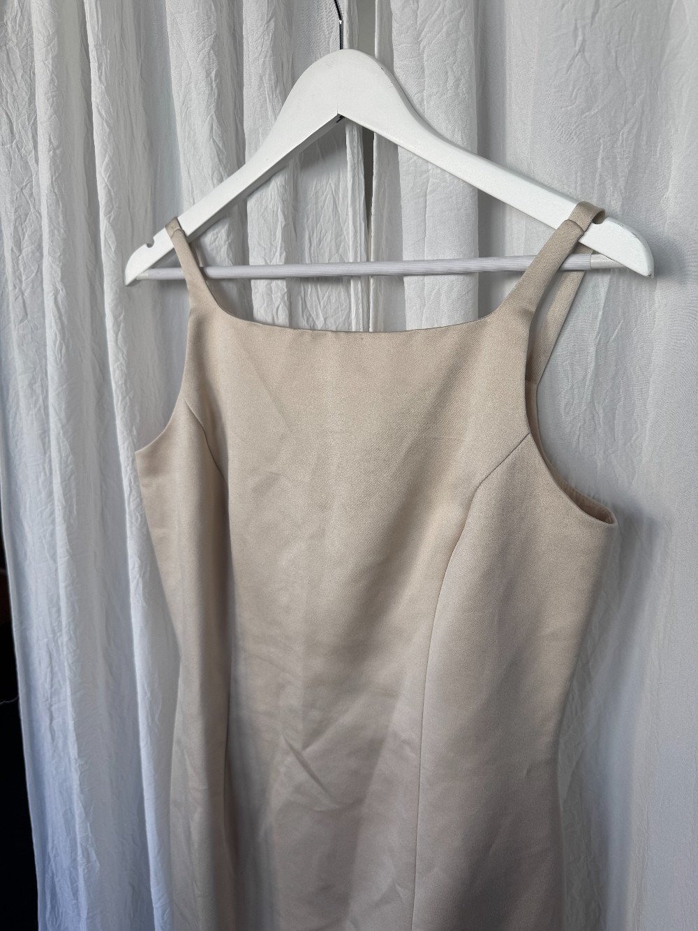 1990S ANN TAYLOR cream satin formal dress. hits about knee-length. strappy low back detail. zip up. non-stretch. fully lined.