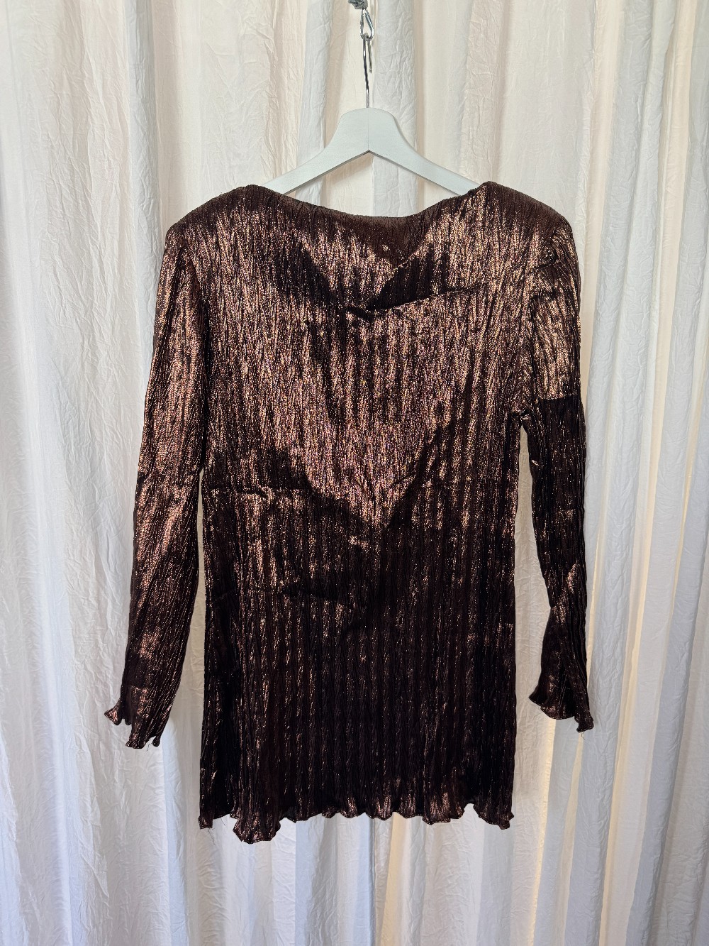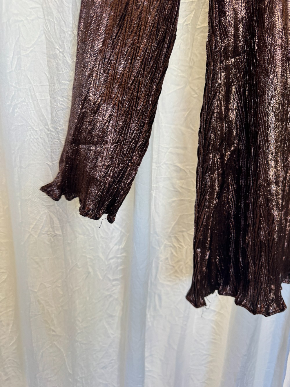 1990s EVAN PICONE bronze metallic chevron print dress. long sleeves. lettuce hem. unlined.