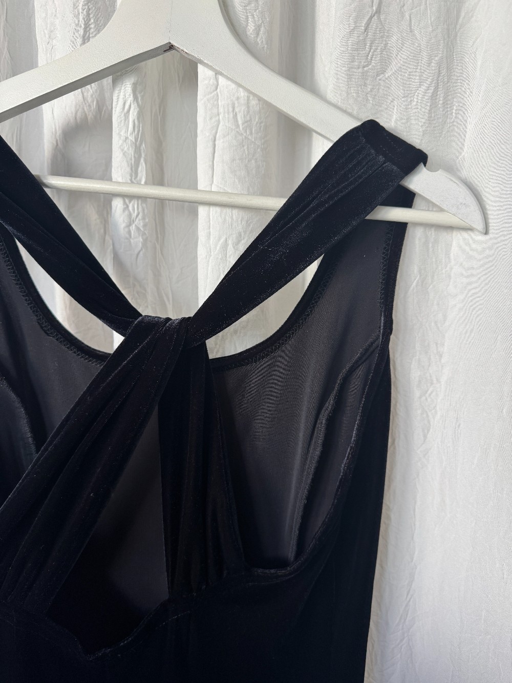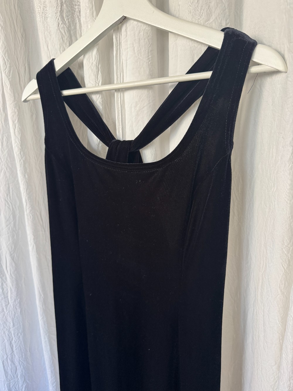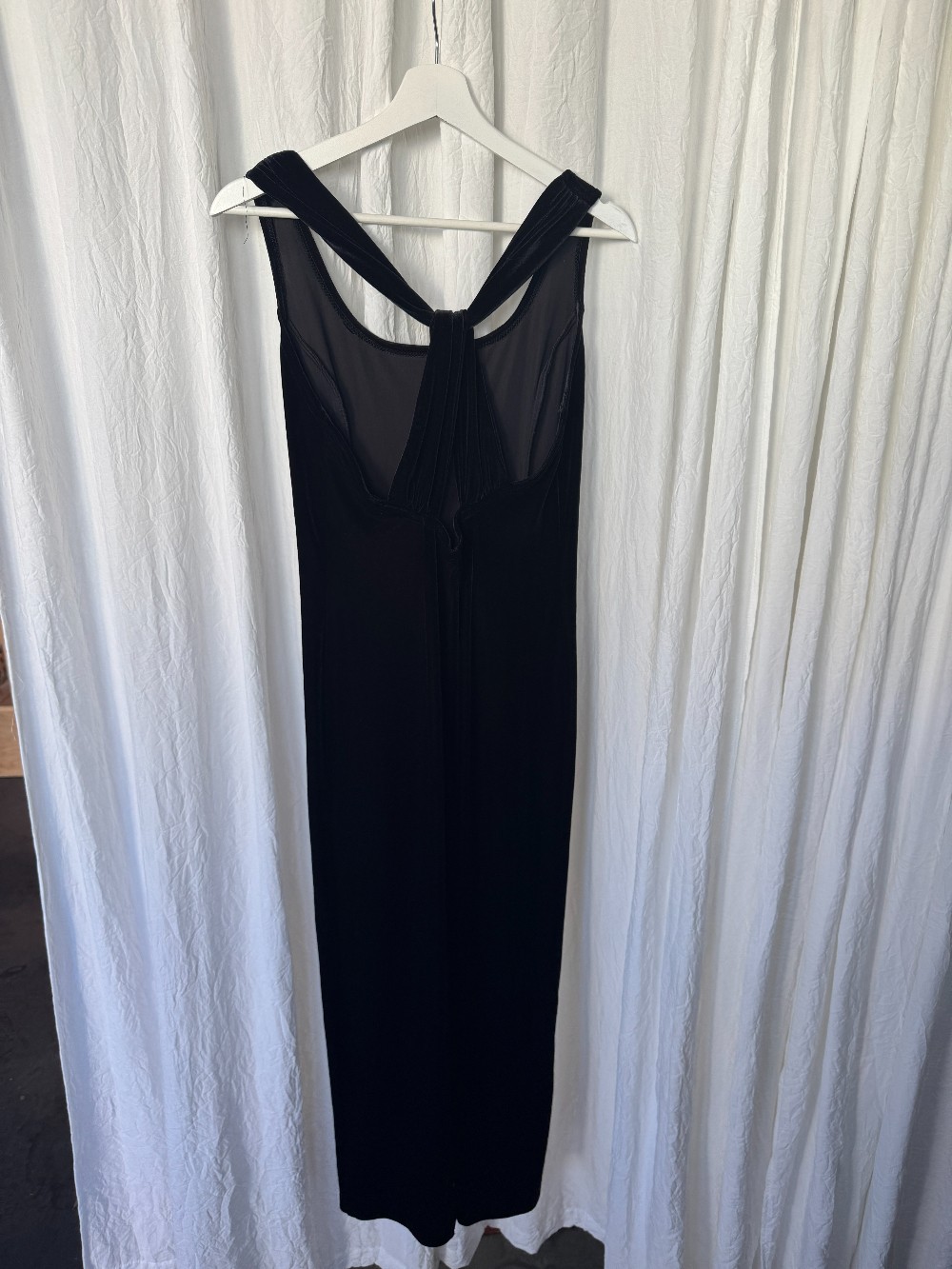 1990s JESSICA MCCLINTOCK GUNNE SAX black velvet maxi gown with twist back detail. stretchy! slip on style.