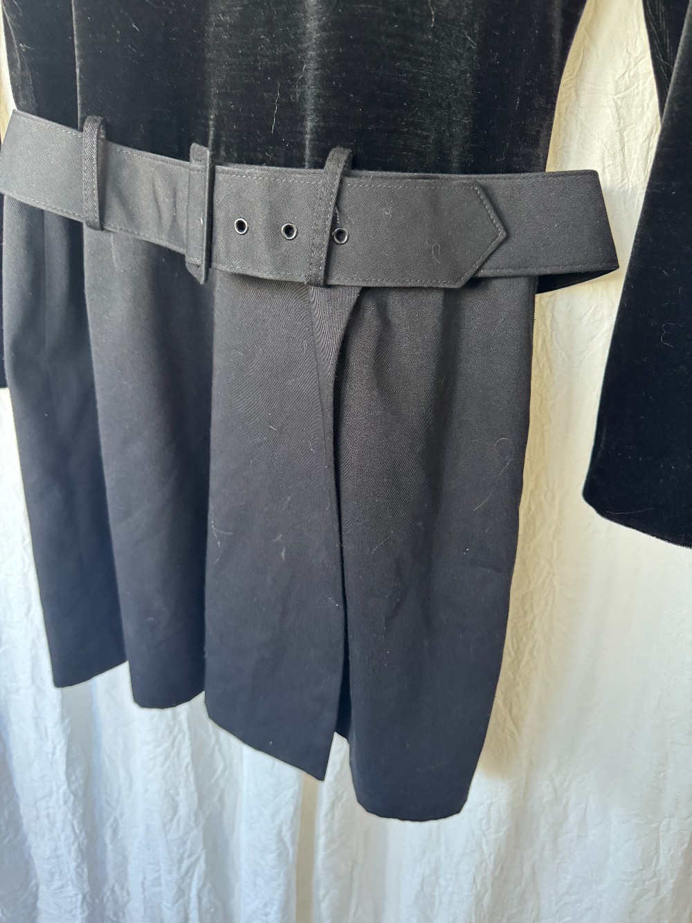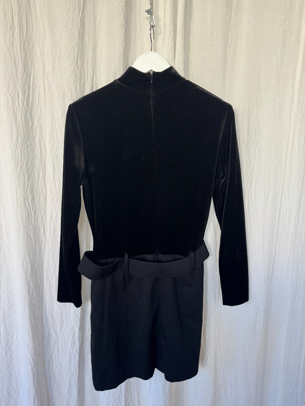 1990s ANN TAYLOR Petites black velvet long sleeve mockneck dress with rayon skirt and belt. low/drop waist. stretchy!