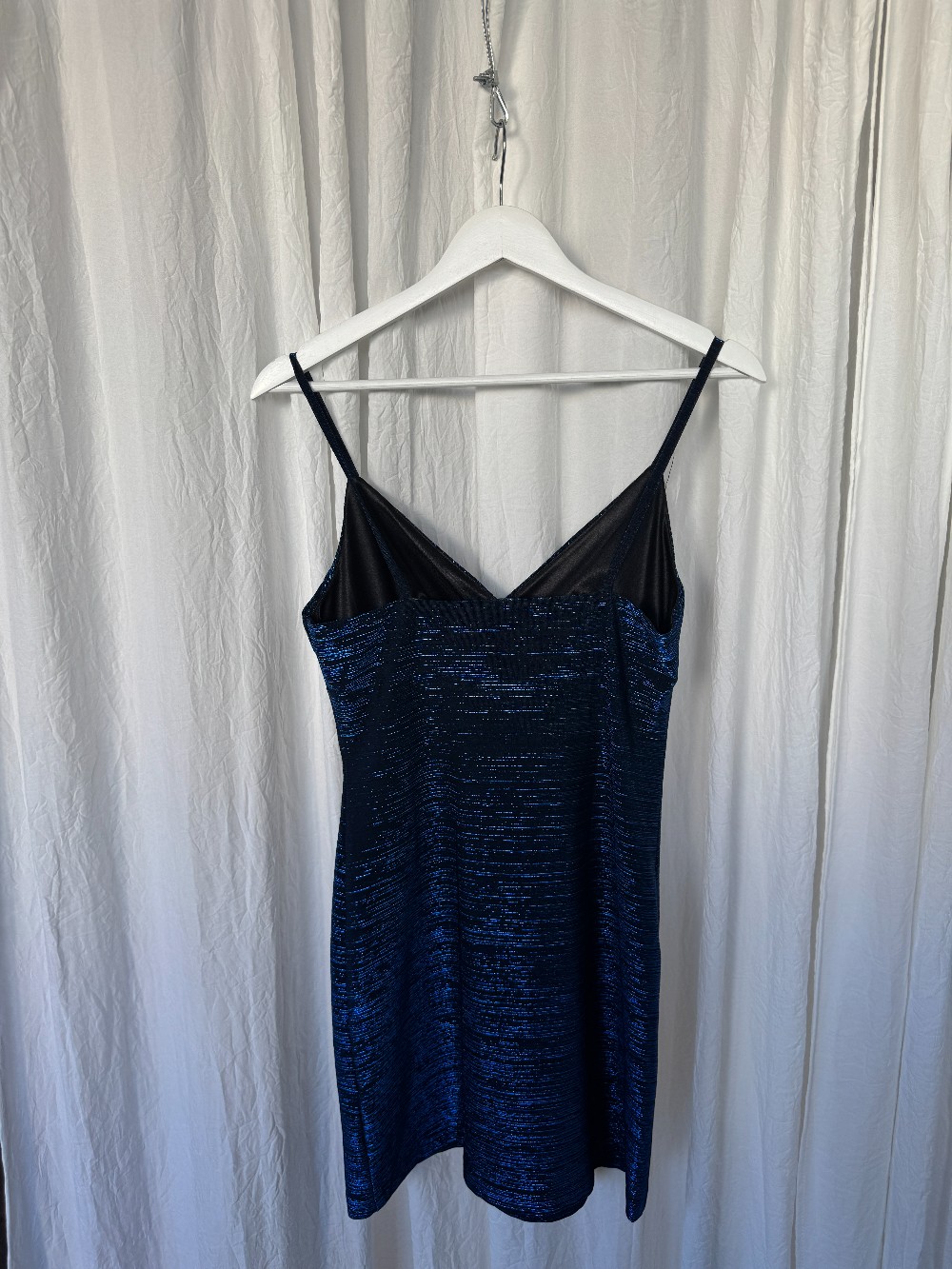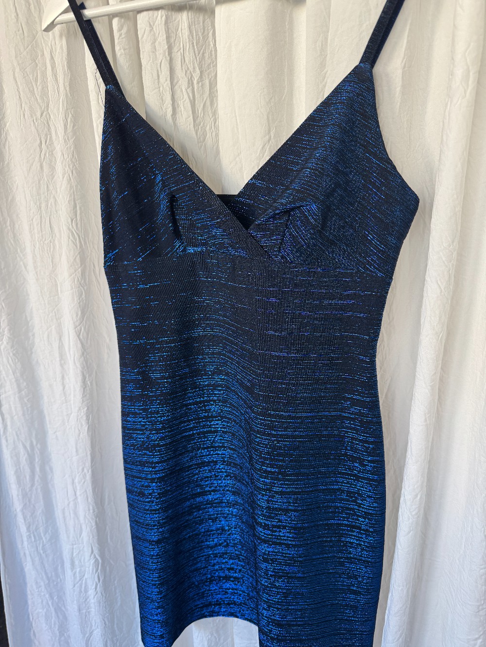 1990s CHARLOTTE RUSSE blue glitter thread sparkly mini dress. spaghetti straps. stretchy. slip on style.