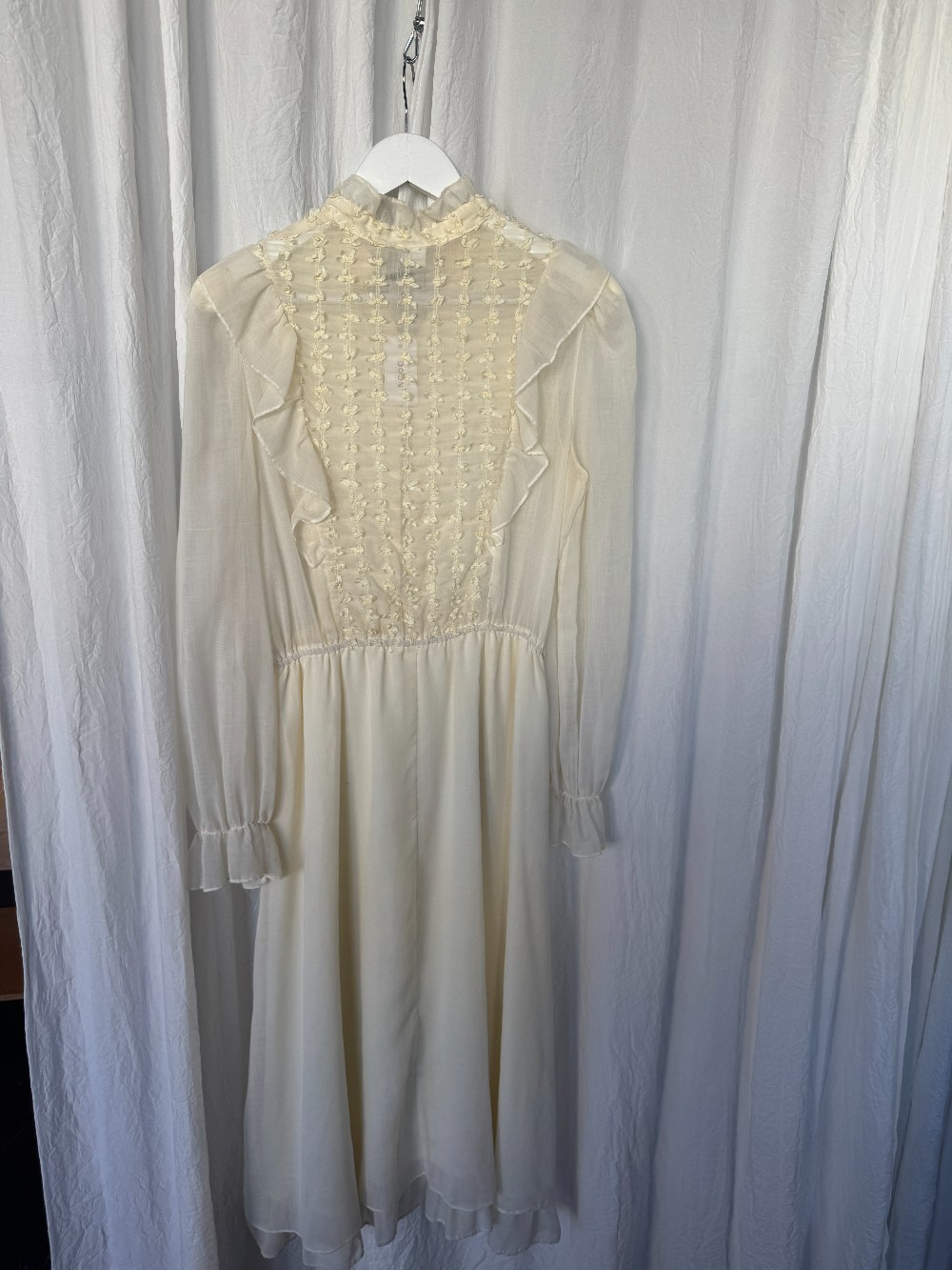 1970s cream colored maxi dress. ruffles and bow details throughout bust and back. elastic and button front. long sleeves with ruffles. elastic waist. slip on style. top portion is unlined, bottom skirt portion had multiple layers.