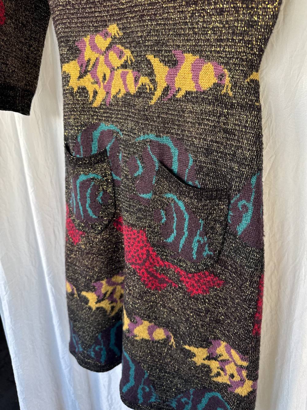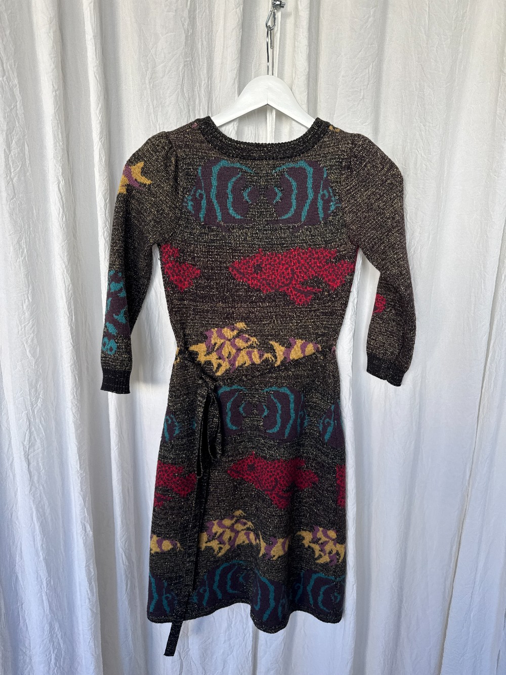Y2K BETSEY JOHNSON wool knit metallic gold thread dress with multi color fish print. pockets. waist tie. stretch.
