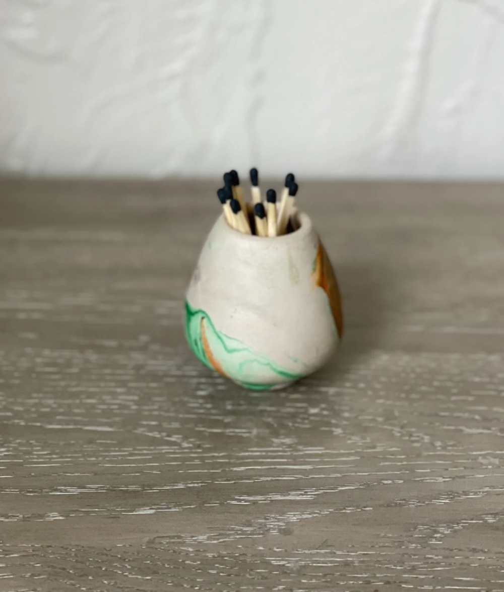 a super detailed swirled Nemadji pottery match holder/mini bud vase from the 1970s.