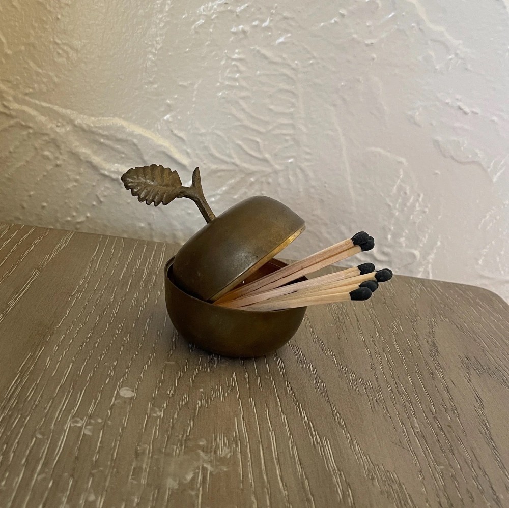 a cutie brass apple match or trinket holder.Measures approx 4” tall by 2” wide