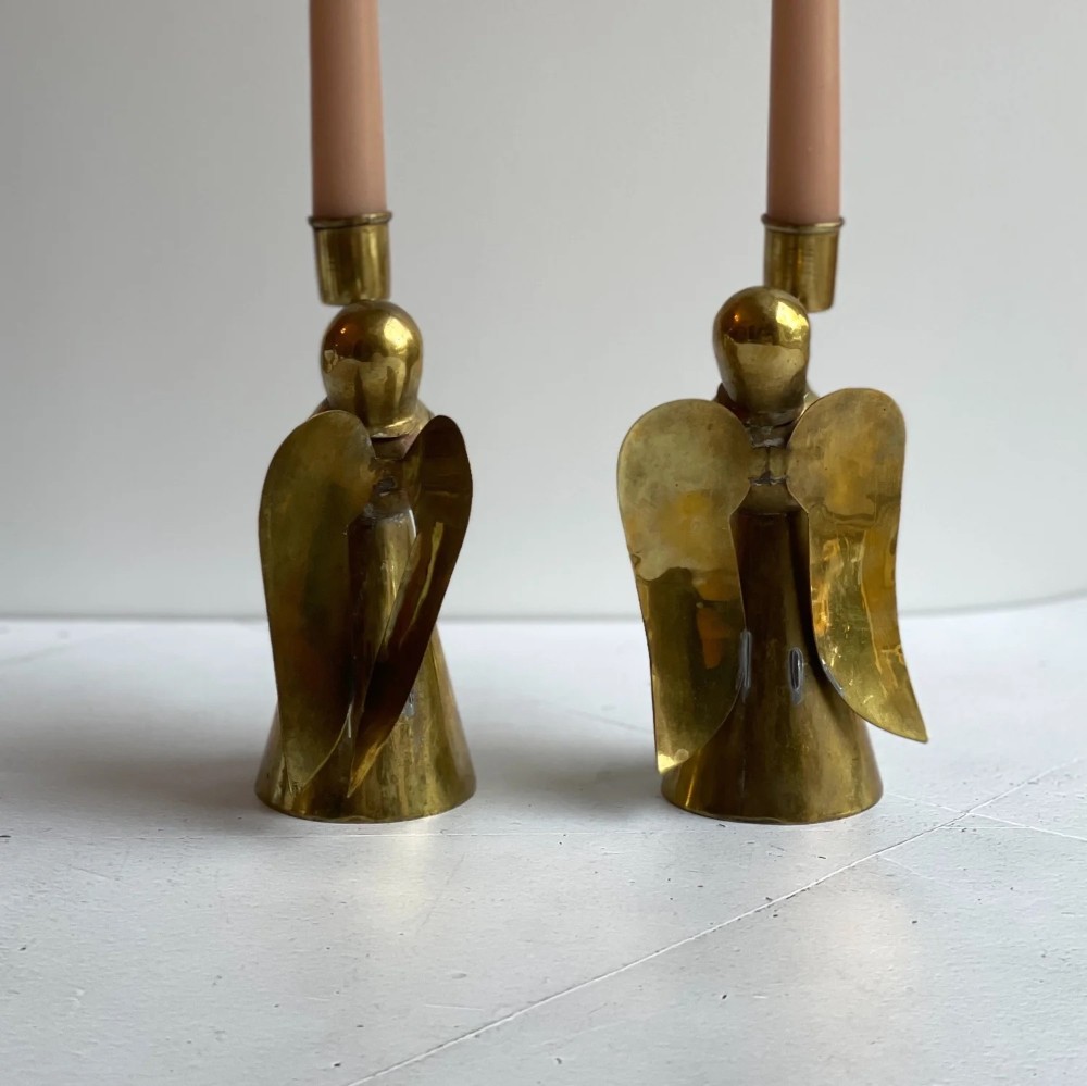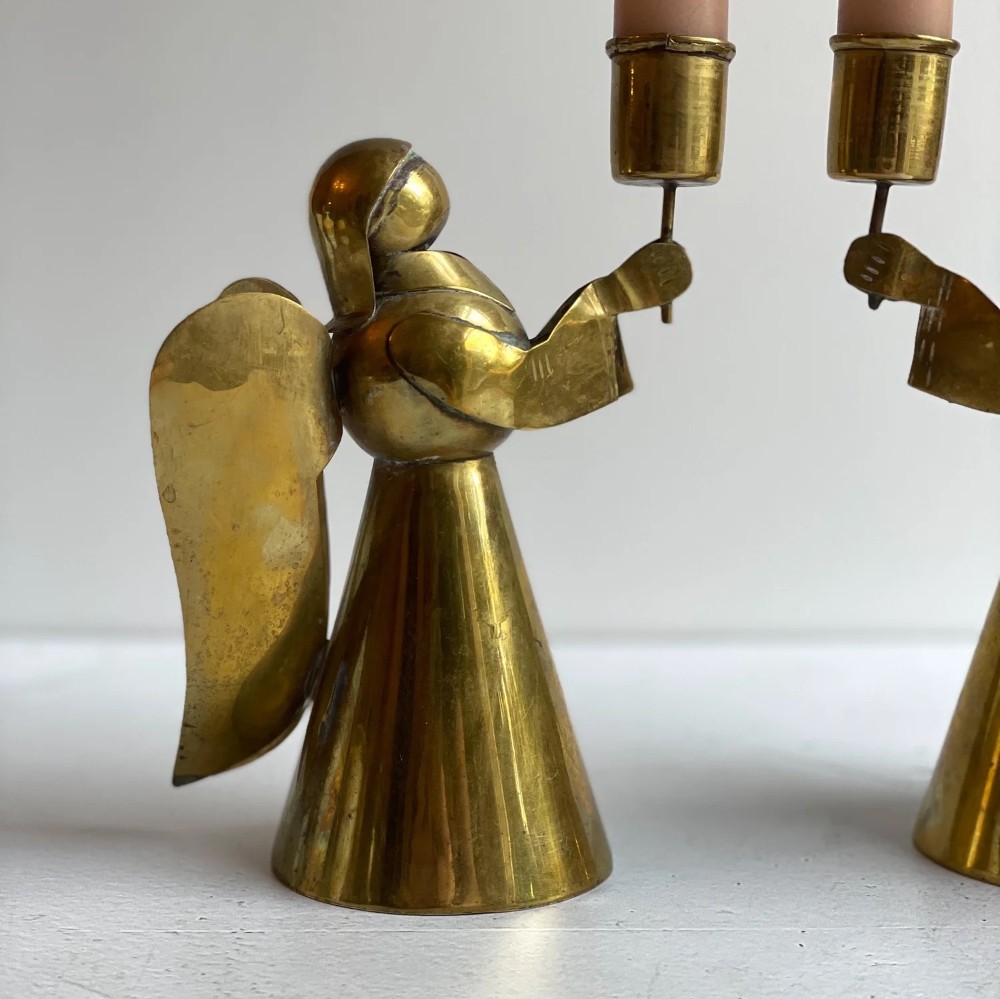 Set of two brass angel candle holders. Perfect for an entryway or dining table for holiday dinners! Some patina, typical with age and wear.