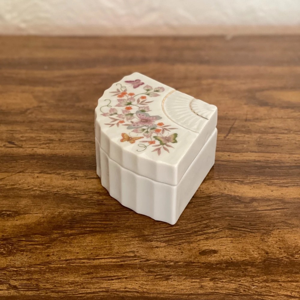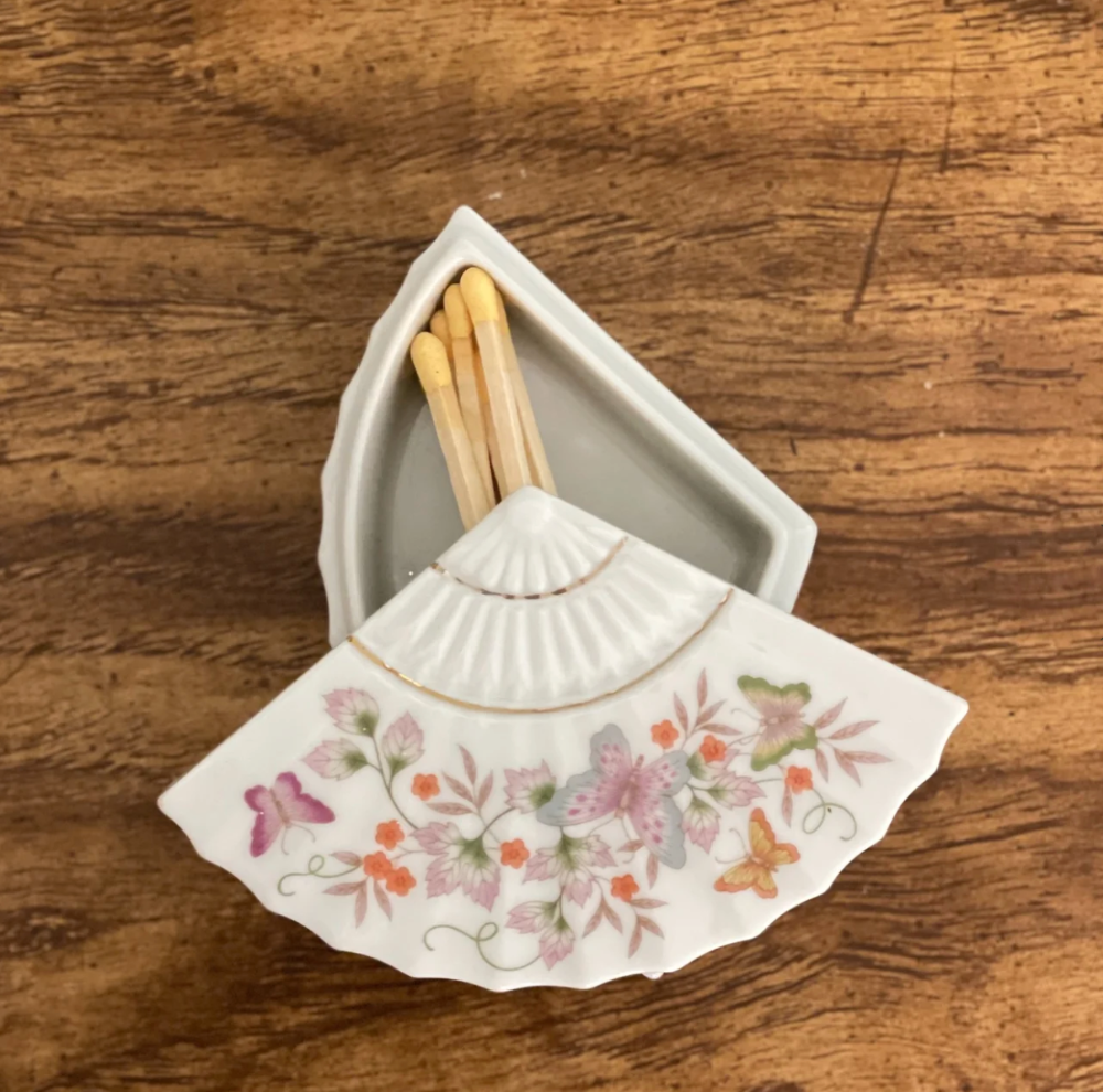 a sweet porcelain fan shaped match holder / trinket box from 1980. Floral and butterfly pattern on lid.
