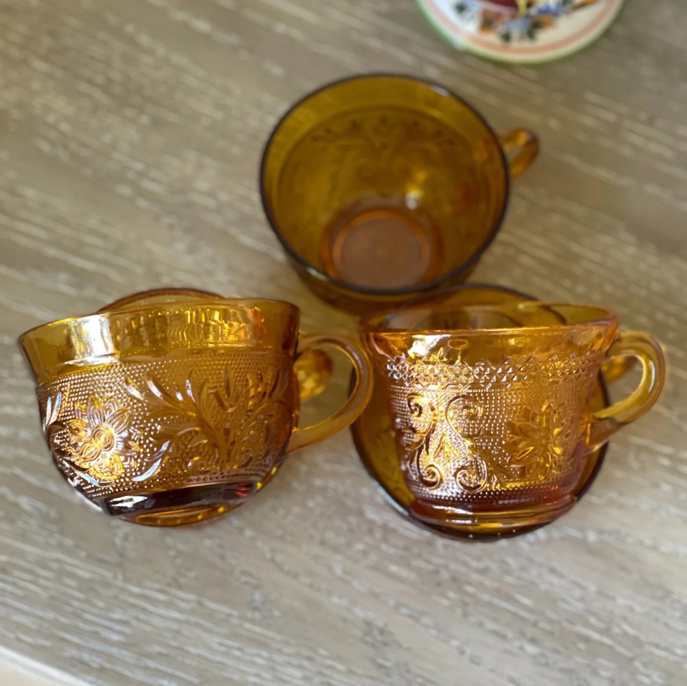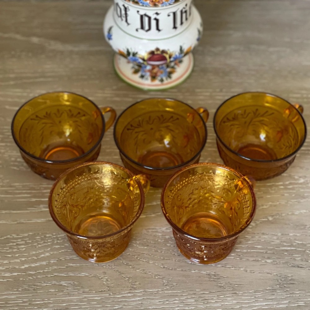 mix match (3 of a kind, 2 of a kind) set of amber colored etched glass cups. perfect for tea, coffee or punch.