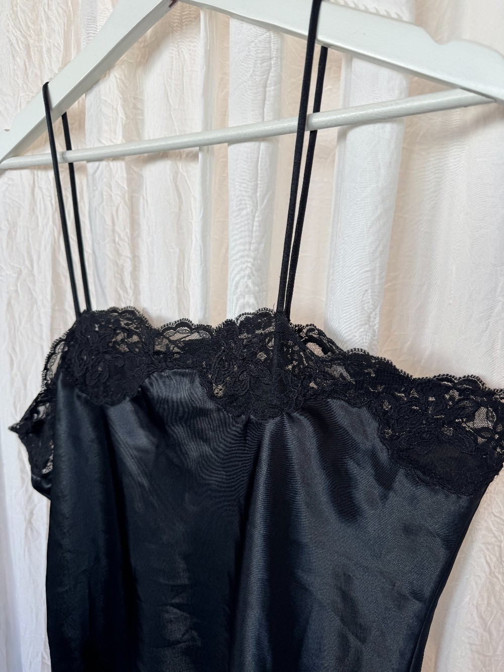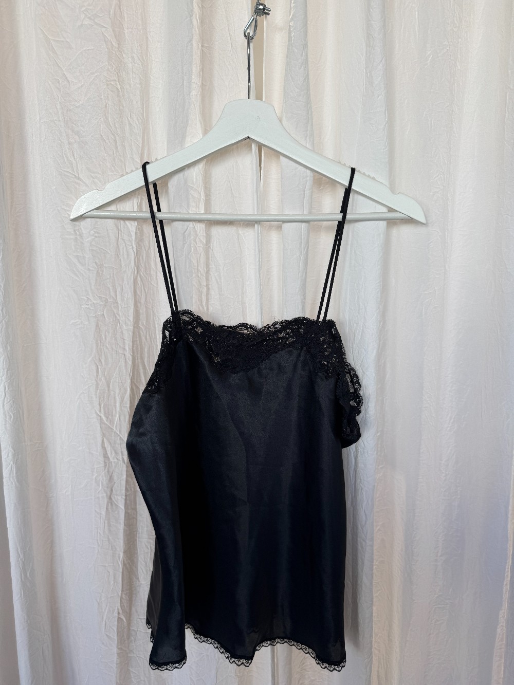 ERIKA TAYLOR black satin tank with lace trim. non stretch.