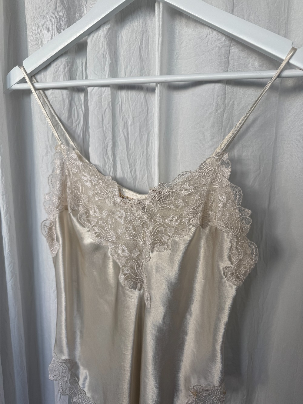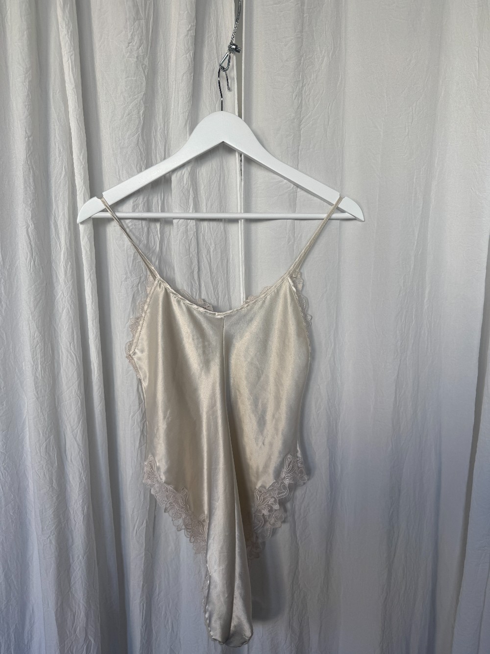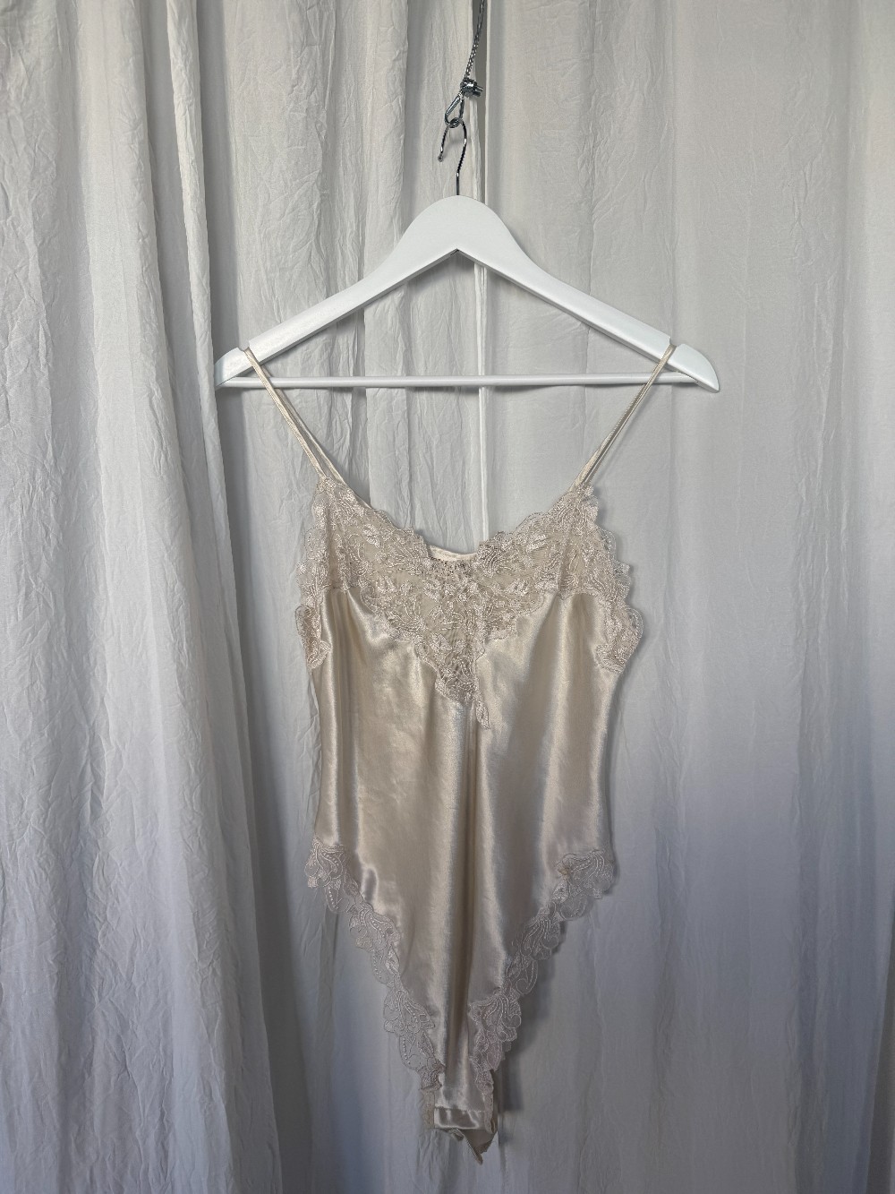 VICTORIA'S SECRET 1990s gold label ivory bodysuit with lace and mesh panel details. fixed straps. snap at bottom.