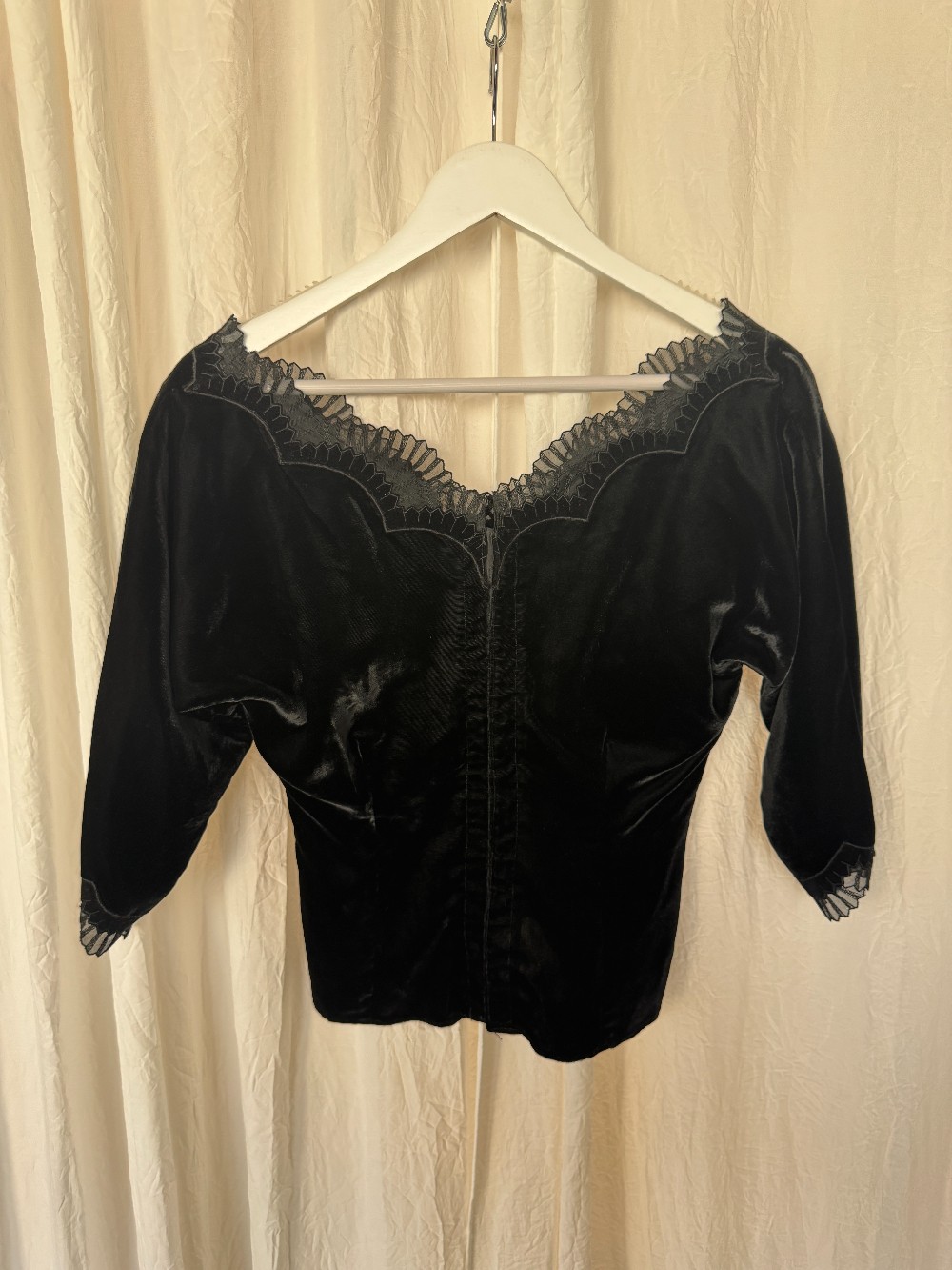 1950s Janet Colton velvet mid sleeve top with scalloped lace trim. Zip up back.