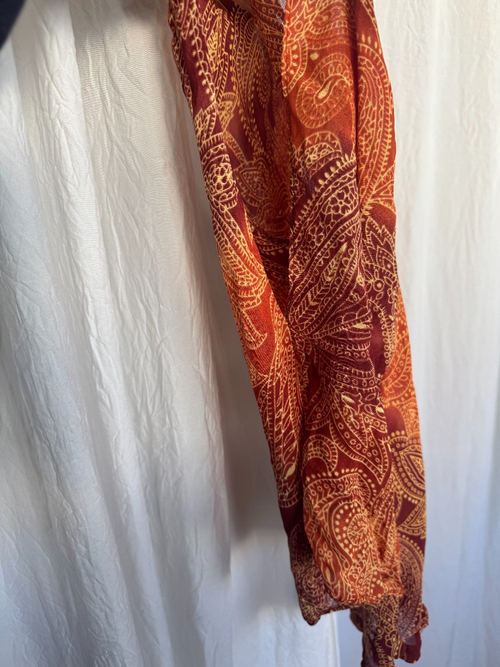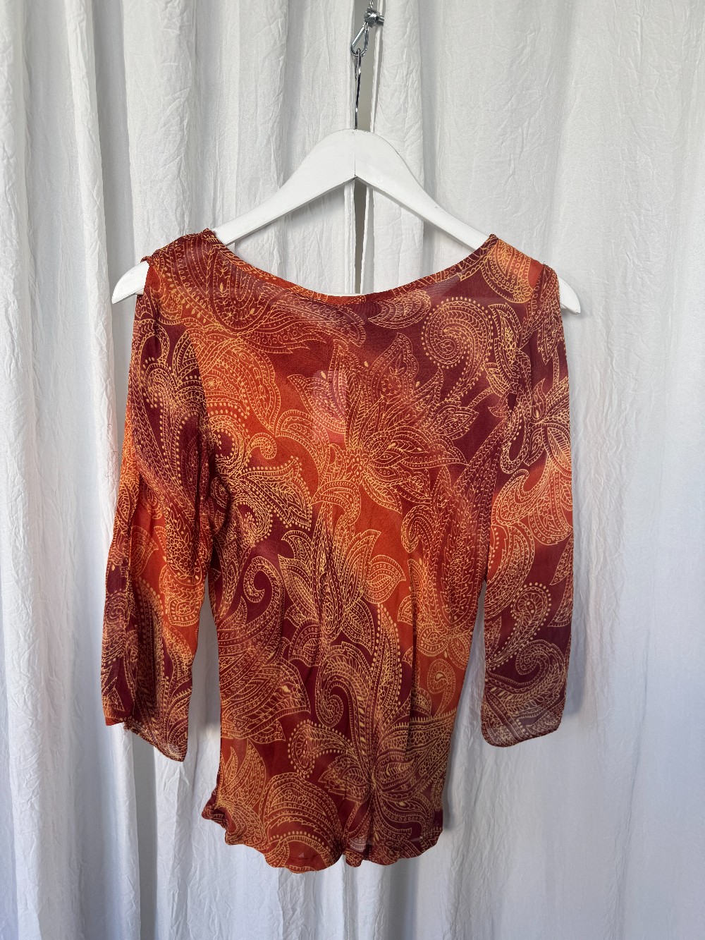 1990s/Y2K THREE HEARTS orange chiffon paisley blouse with 3/4 sleeves that are just pinched midway, mostly open. slip on style. bias cut.