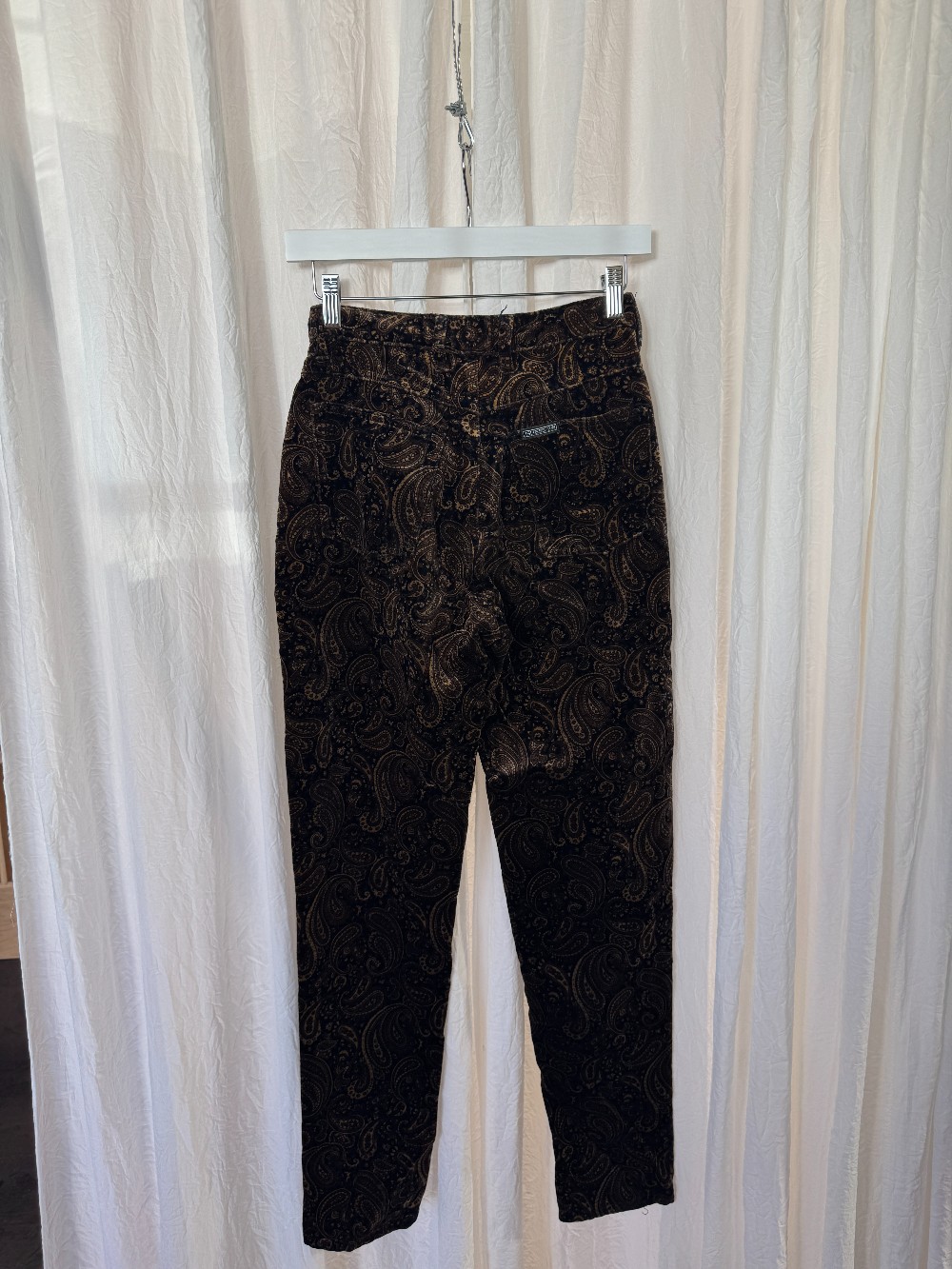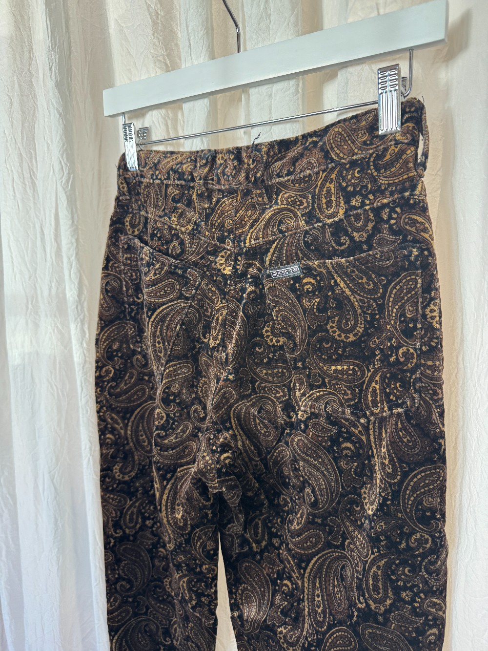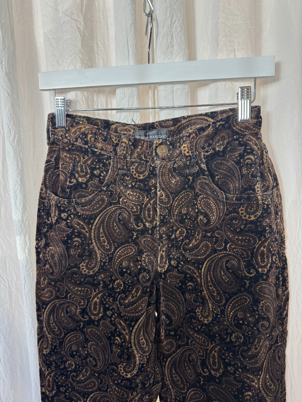 1990S GUESS BY MARCIANO black velvet straight leg pants in a tan and brown paisley print.
