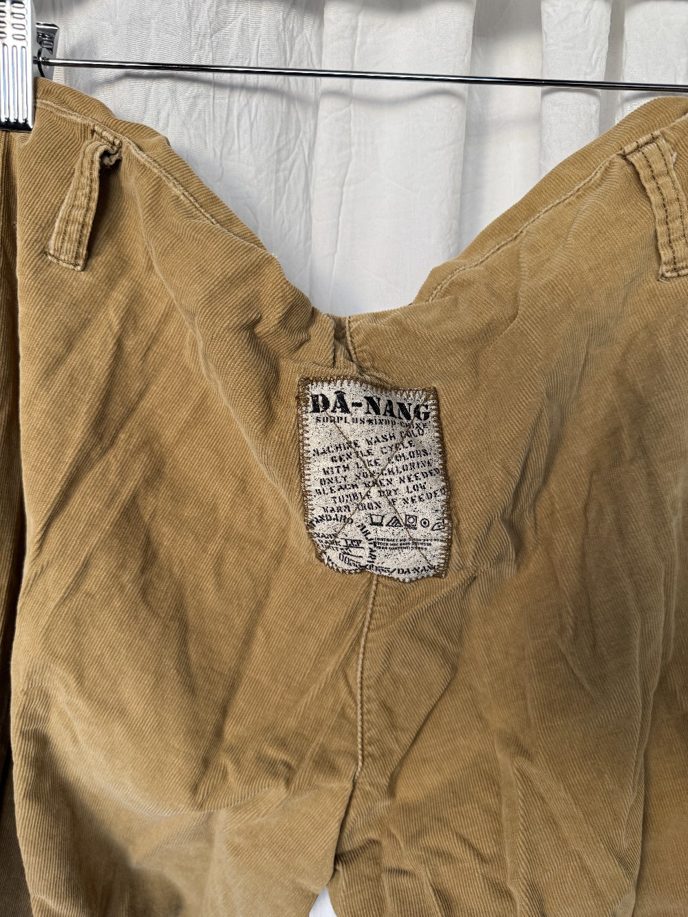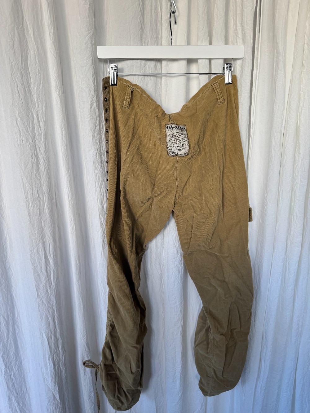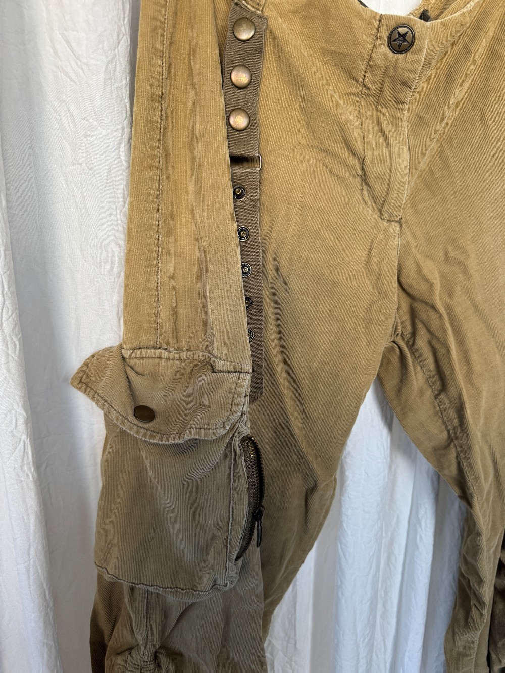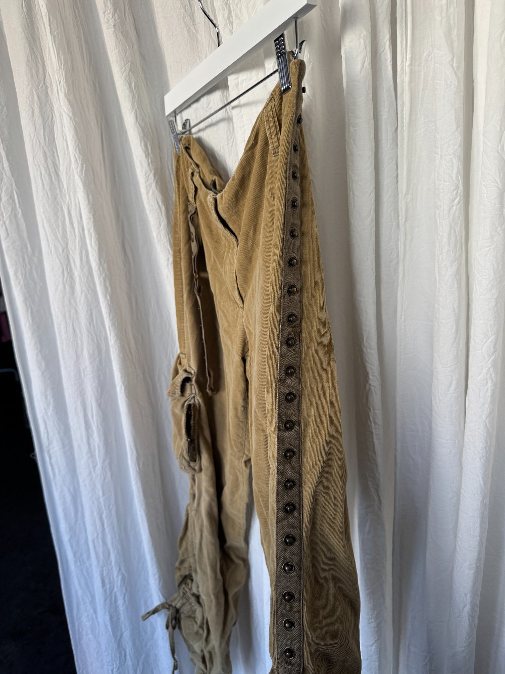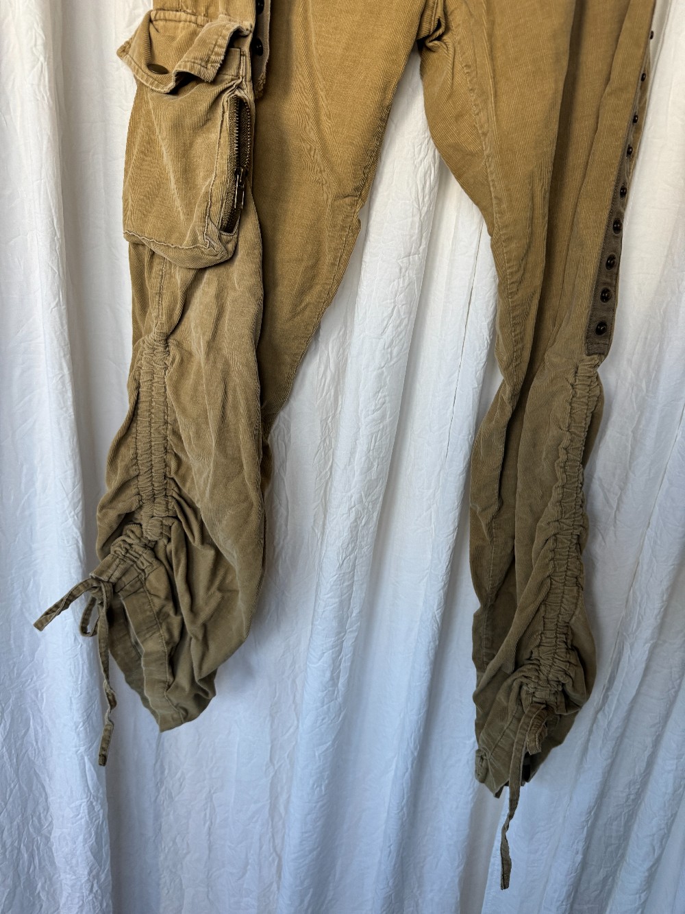 Y2K DA-NANG tan corduroy cargo pants with olive green trim and brass snaps, pockets, ruching- tons of detail. meant to have a baggy, low - rise fit.