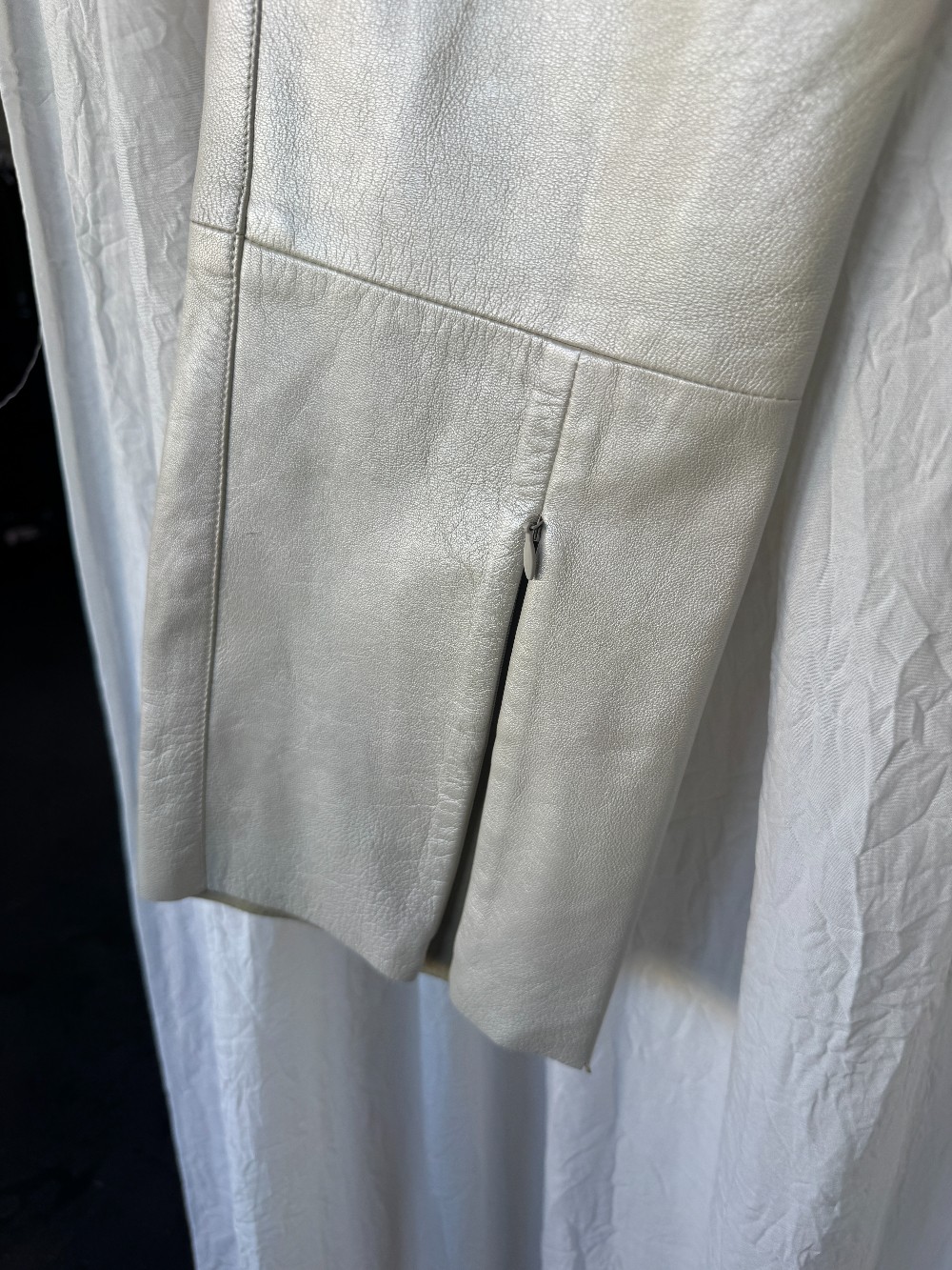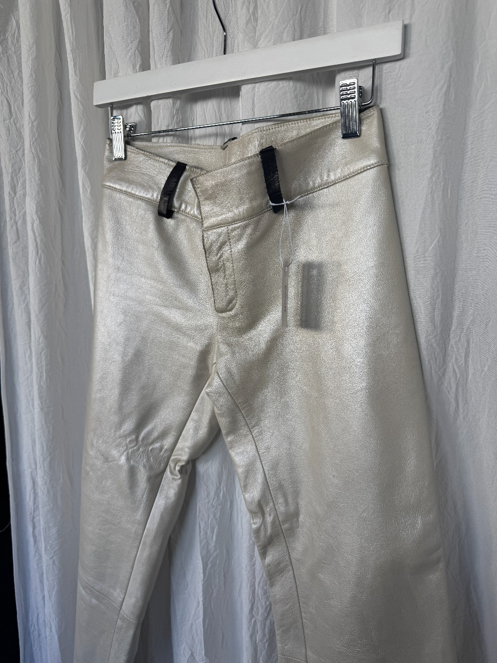 unmarked metallic sheen white leather capri pants. zip fly. black belt loops. zipper on back pant leg. unlined.