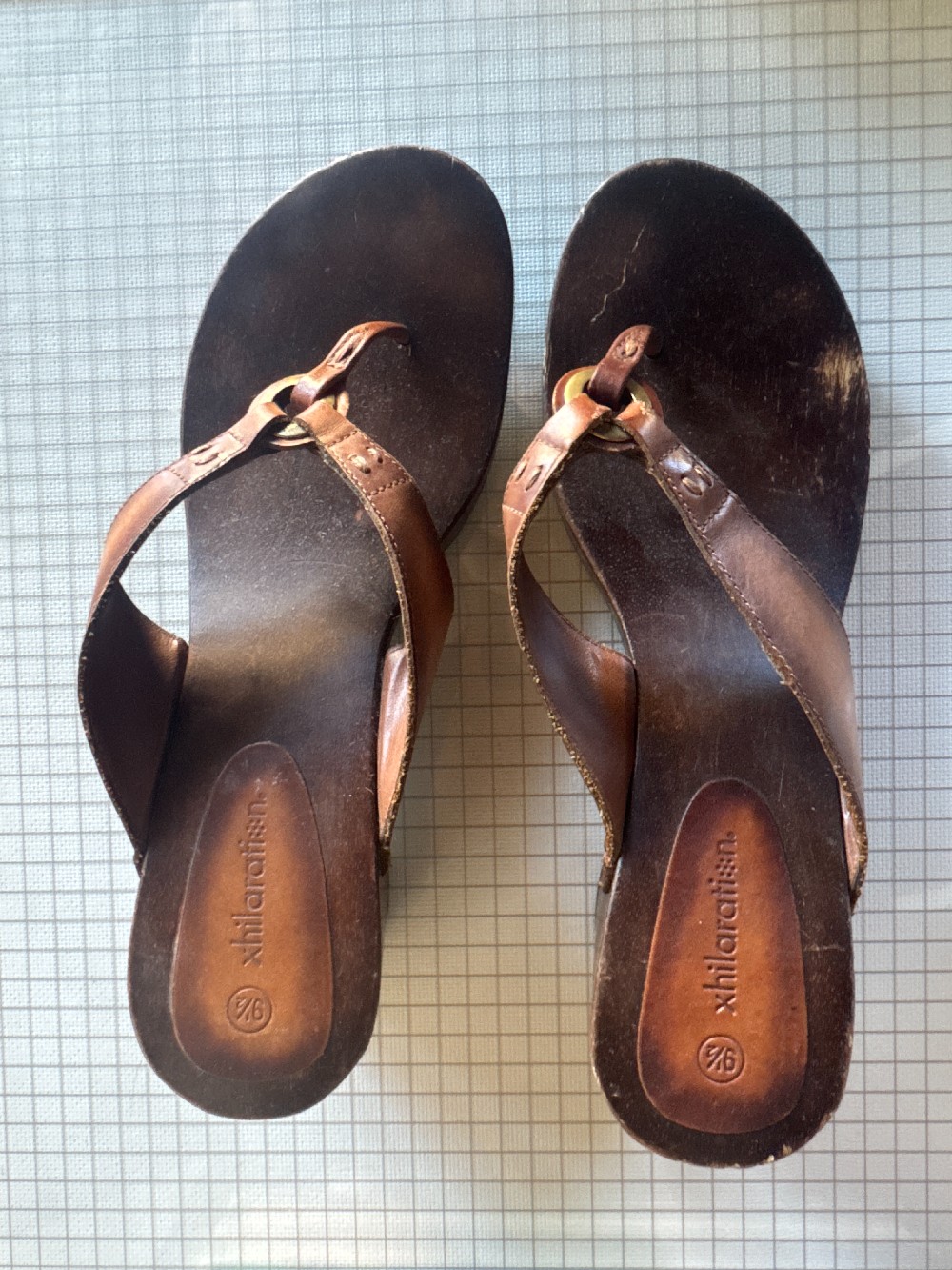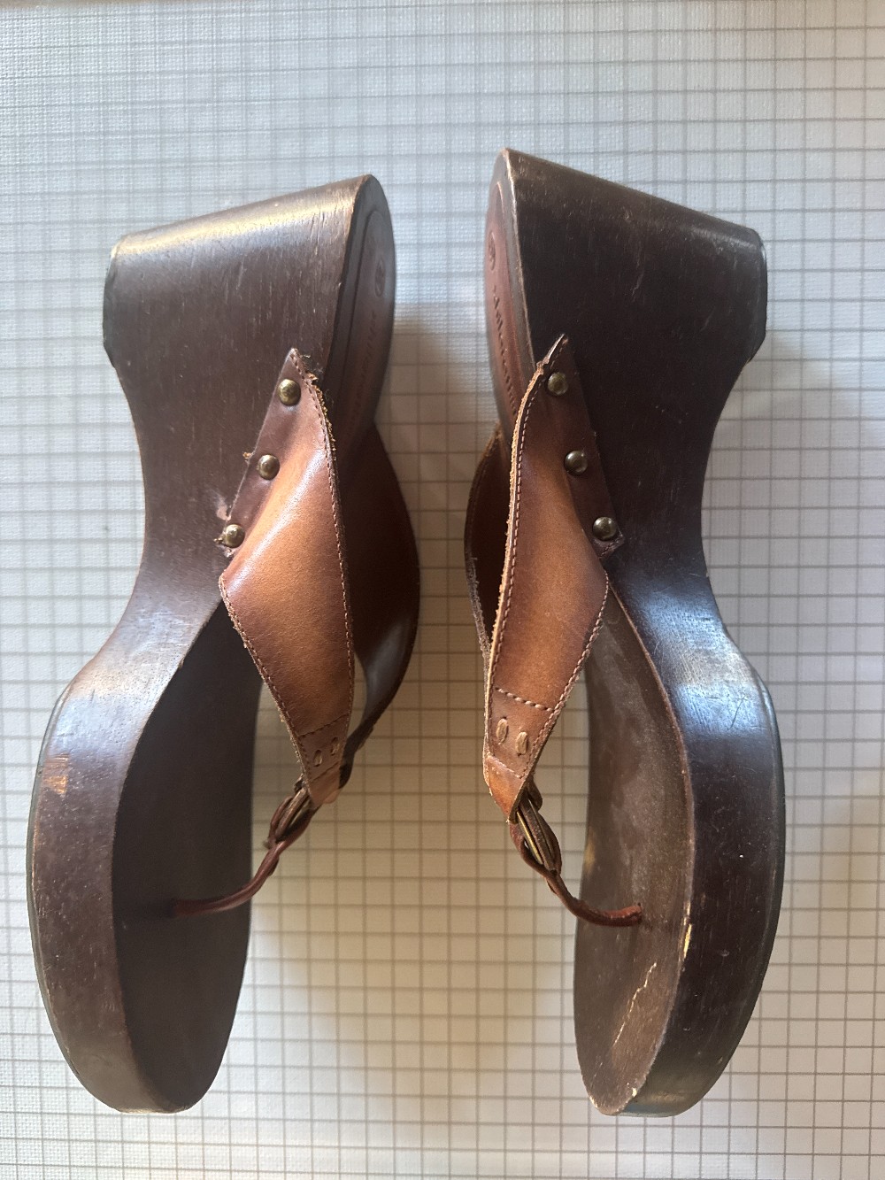 1990s xhilaration wooden wedge, leather thong strap sandalssize 9.5
