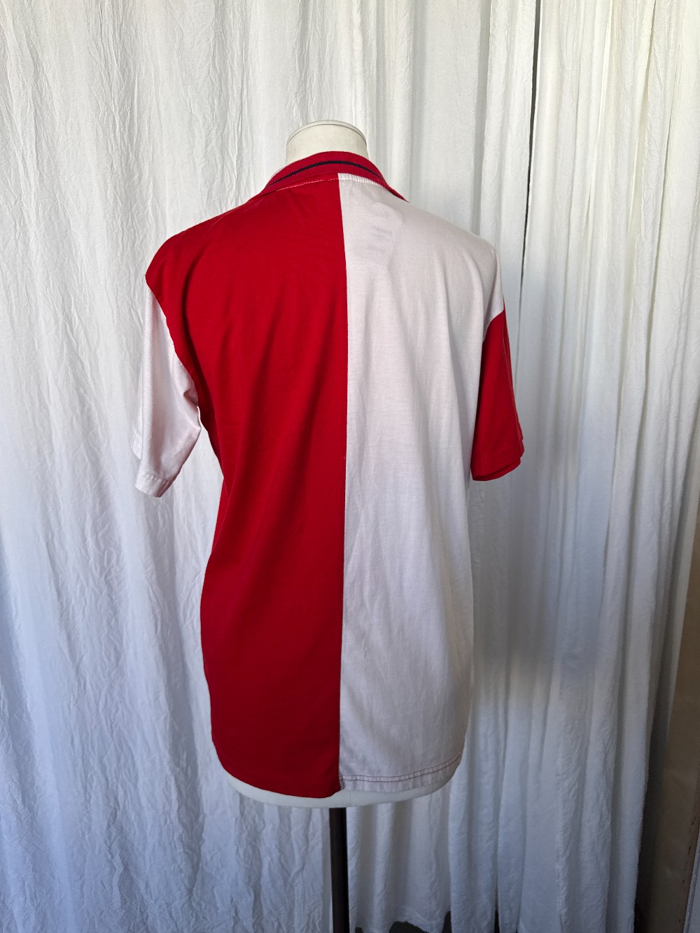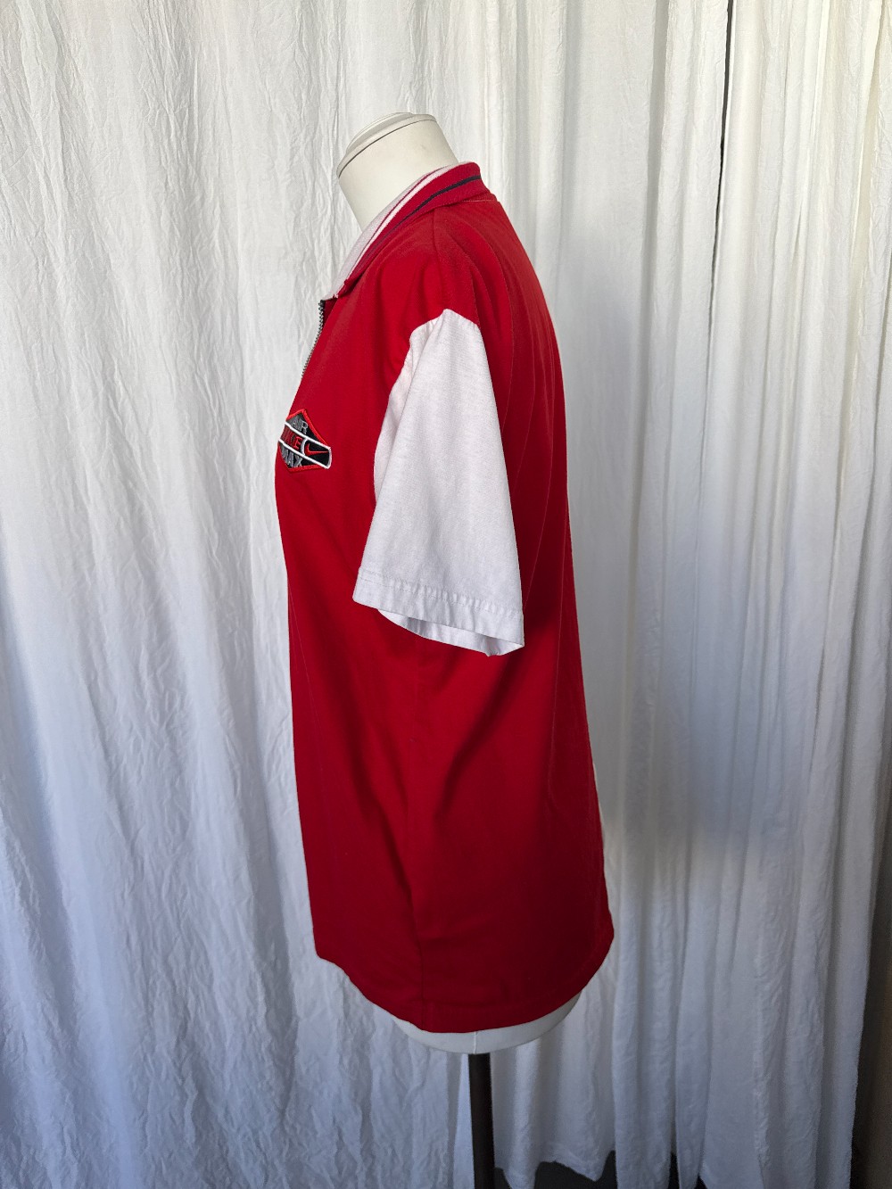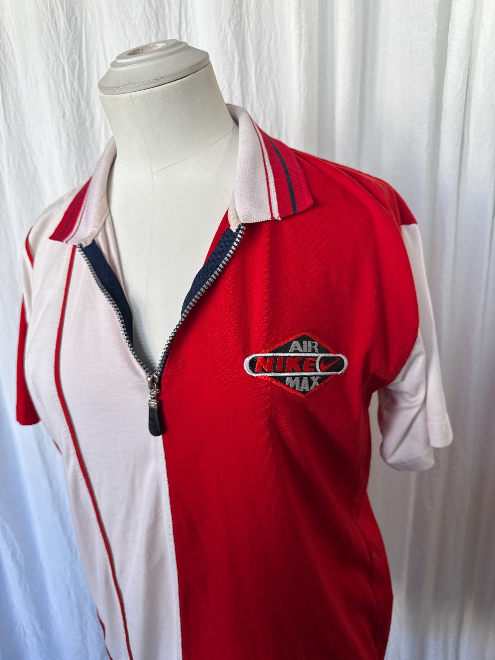 1990s NIKE AIR MAX red and white qrtr zip short sleeve shirt. collared. color-block. nike logo and swoosh on zipper pull.