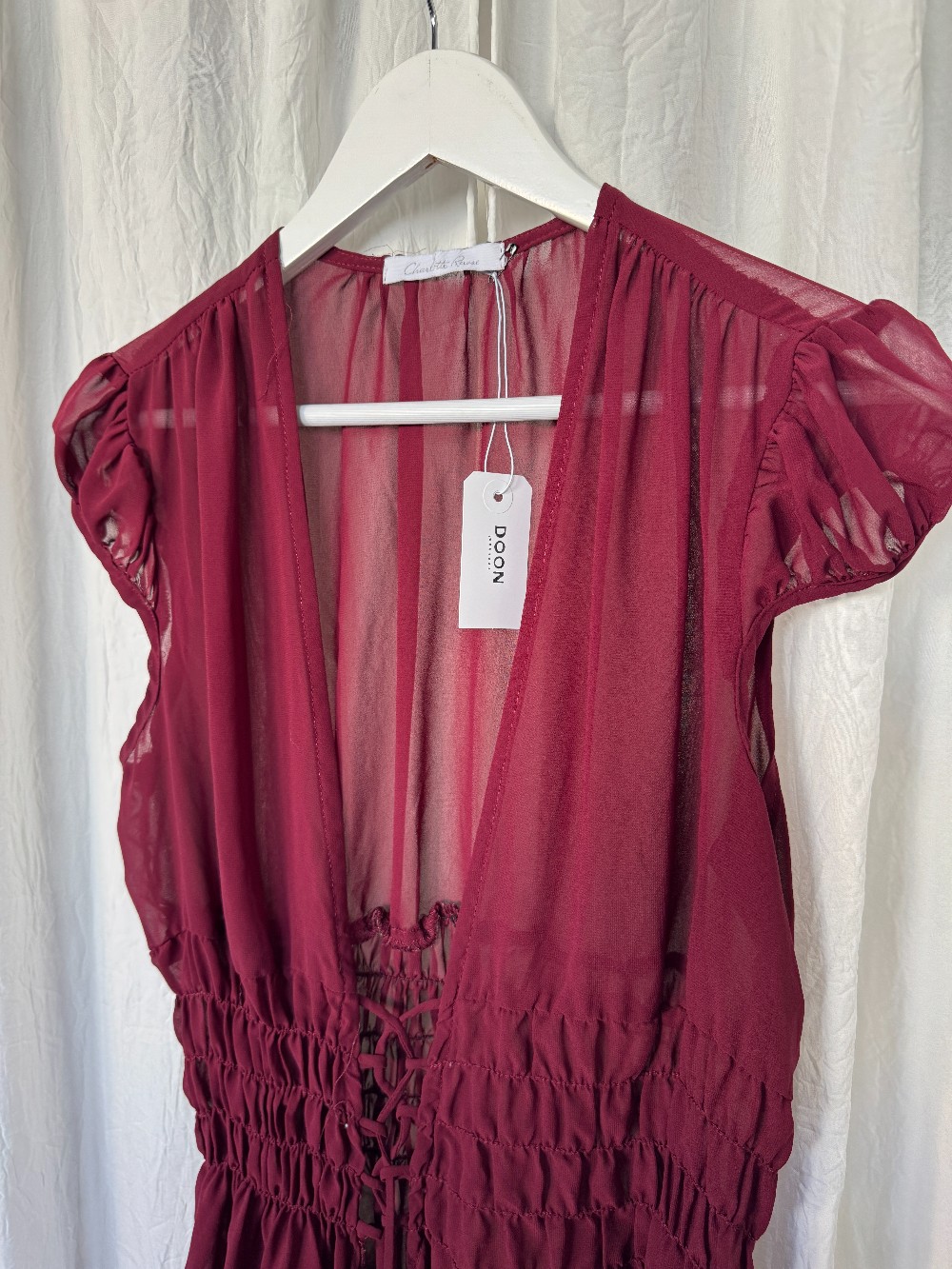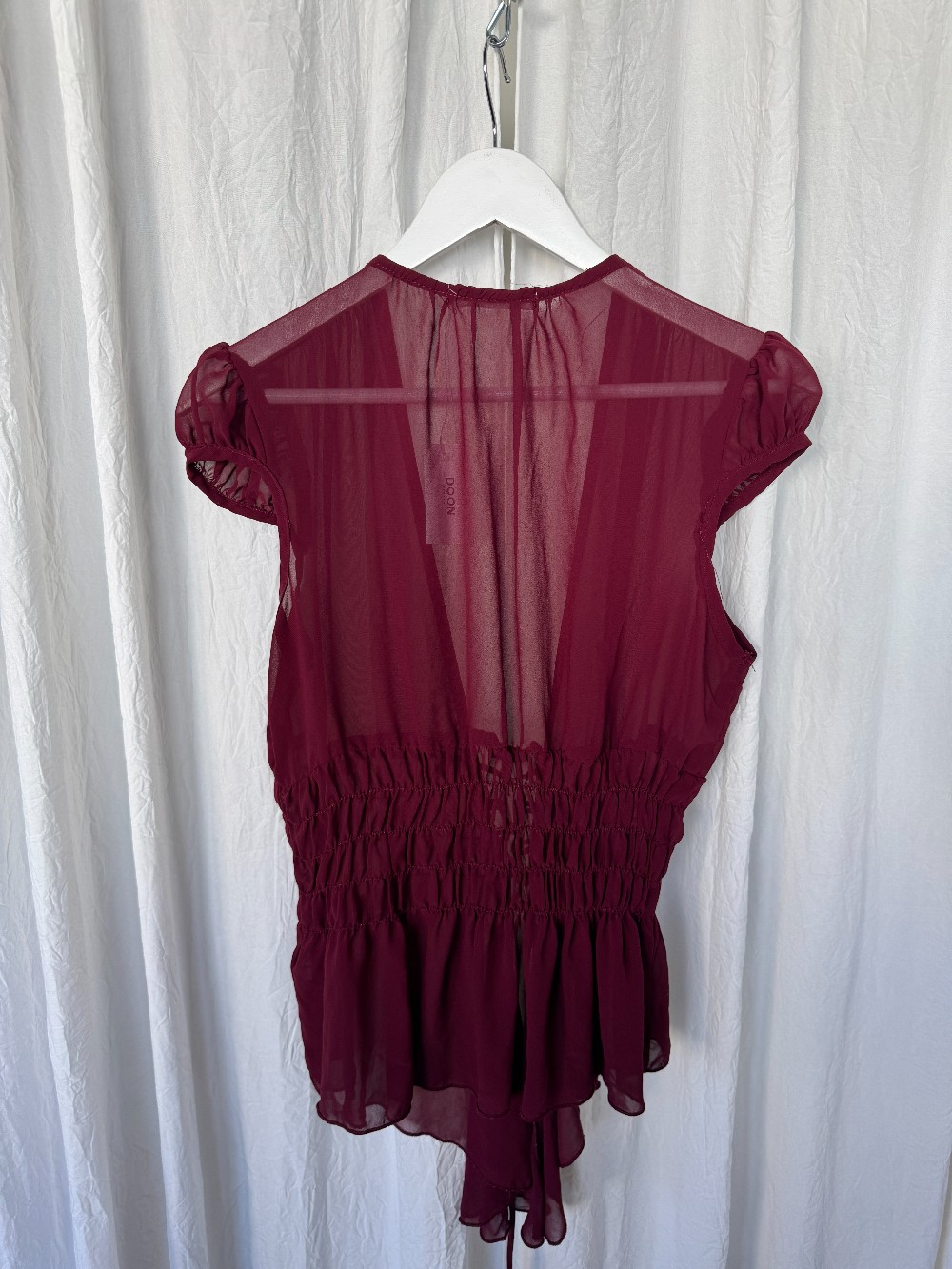 Y2K CHARLOTTE RUSSE maroon sheer chiffon blouse with cap sleeves and ruched tie up waistline