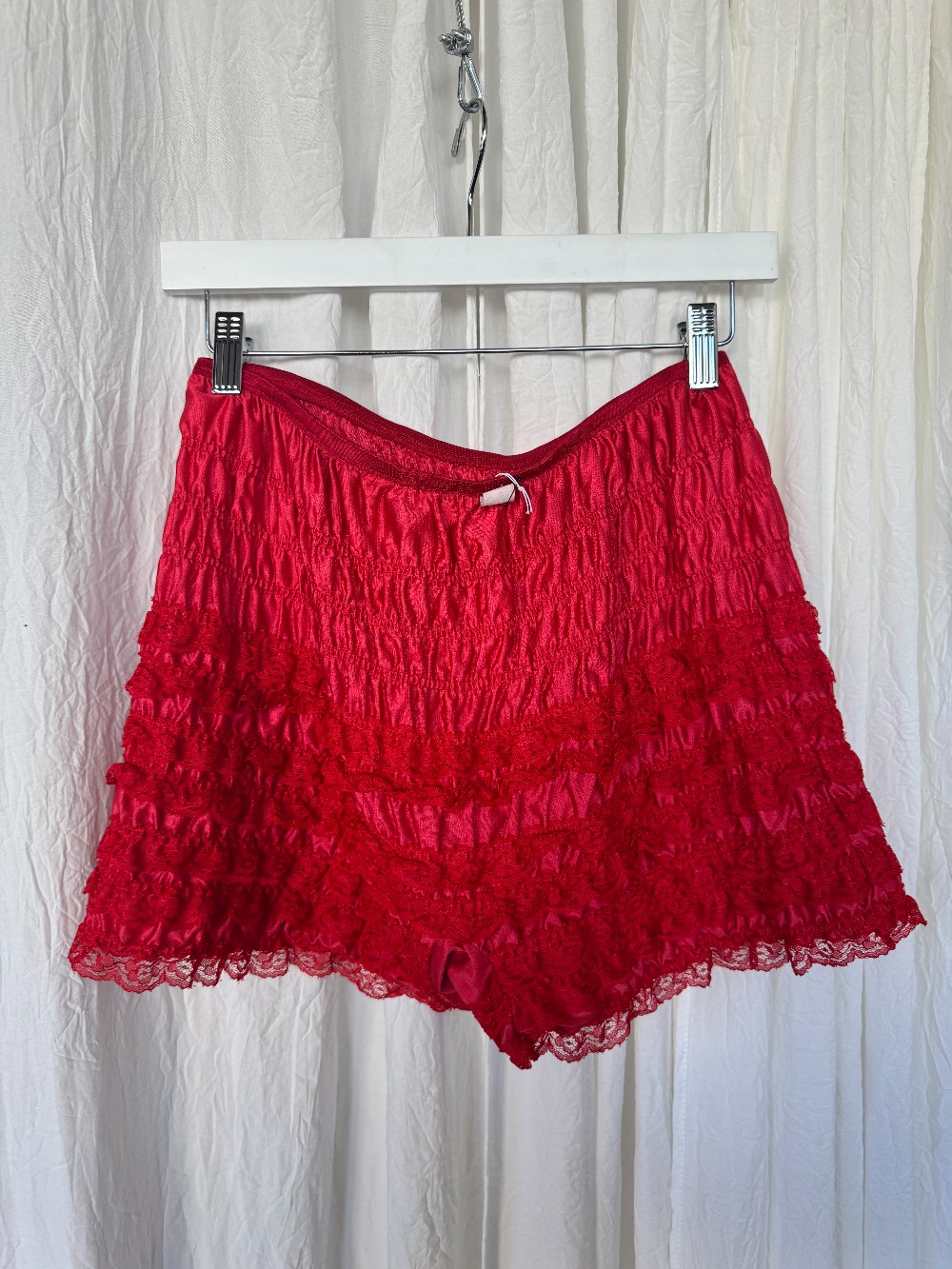 1960s vintage red bloomers with red ruffle lace trim. stretchy and elastic waist