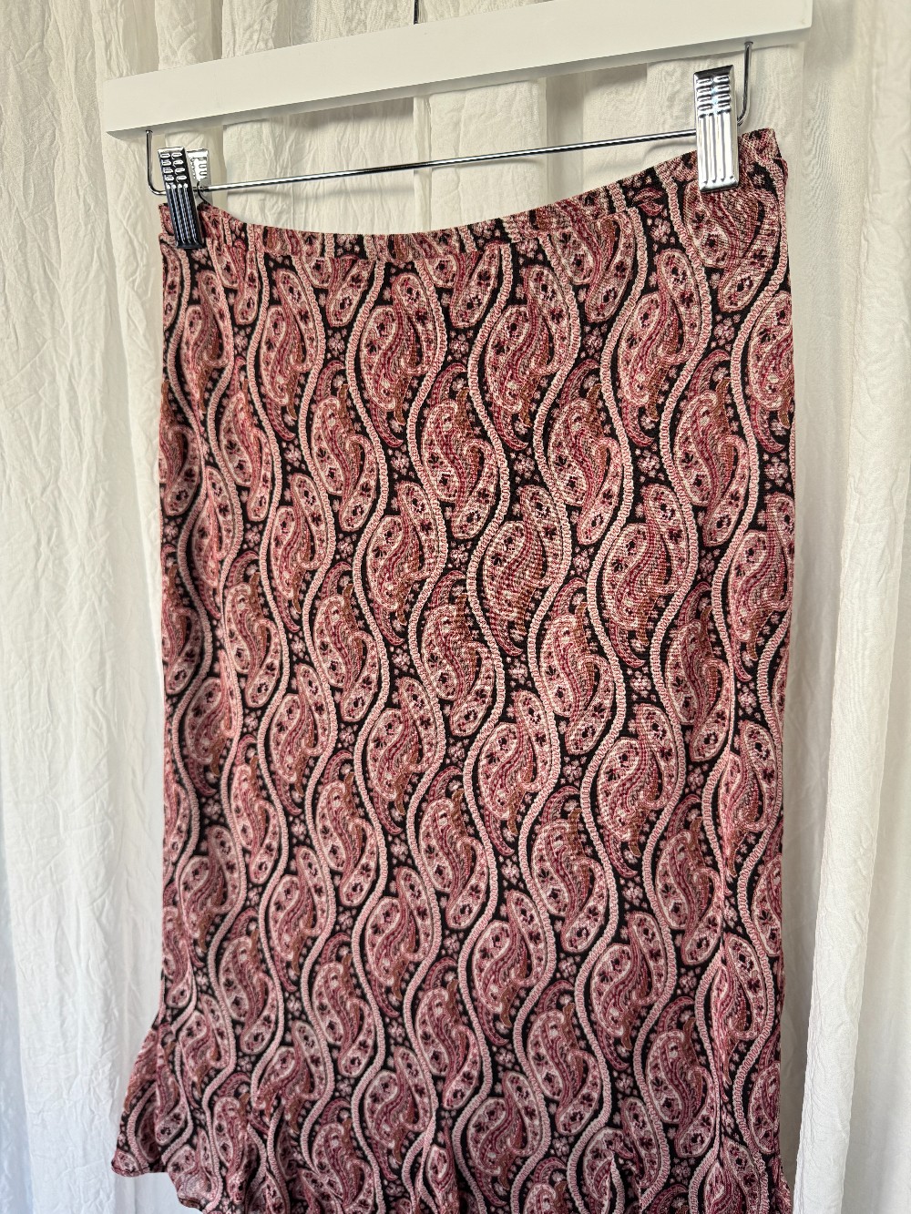 Y2K EXPRESS burgundy/black/pink/tan midi skirt. slight ruffle at hem. fully lined. stretchy!