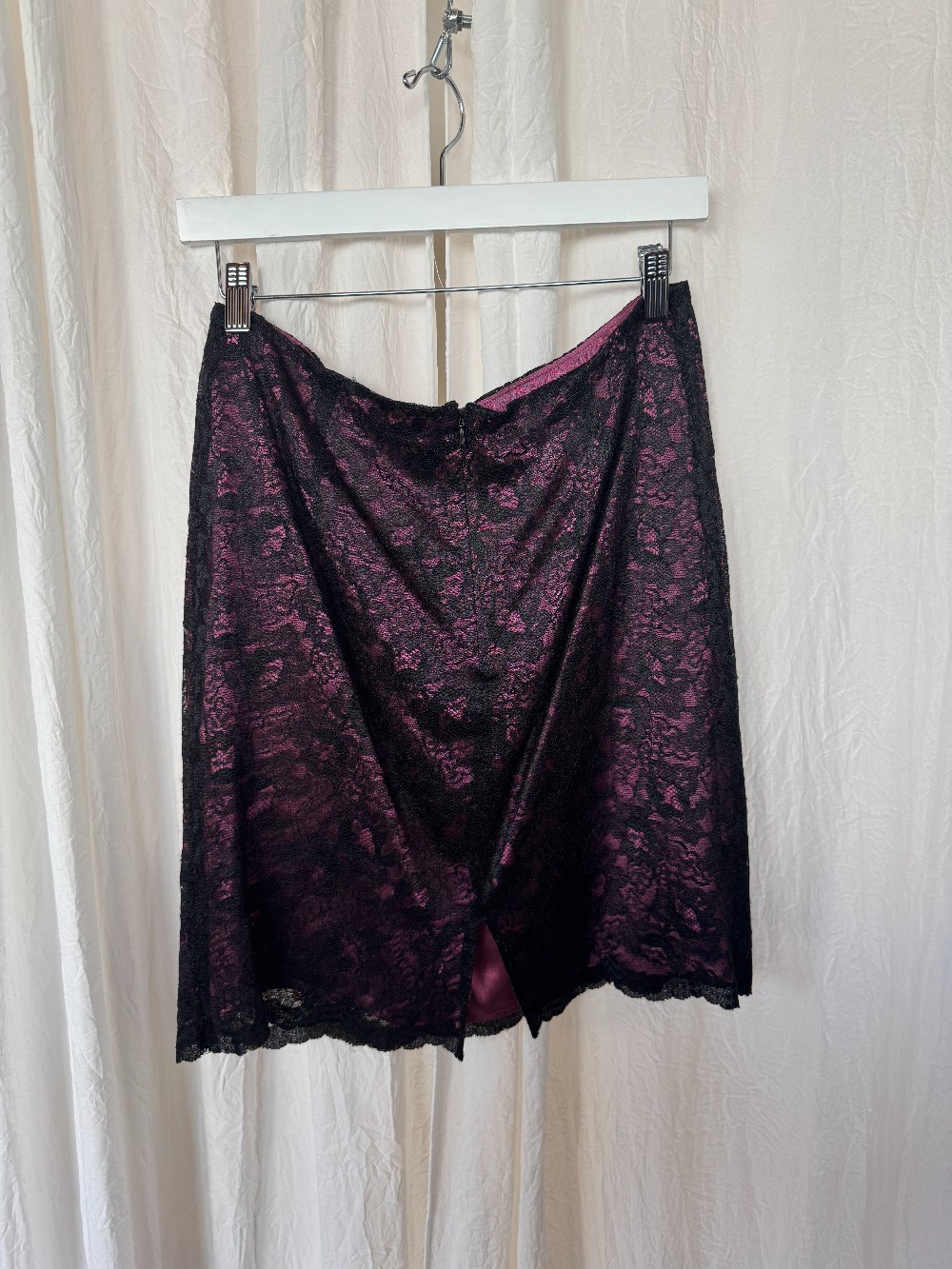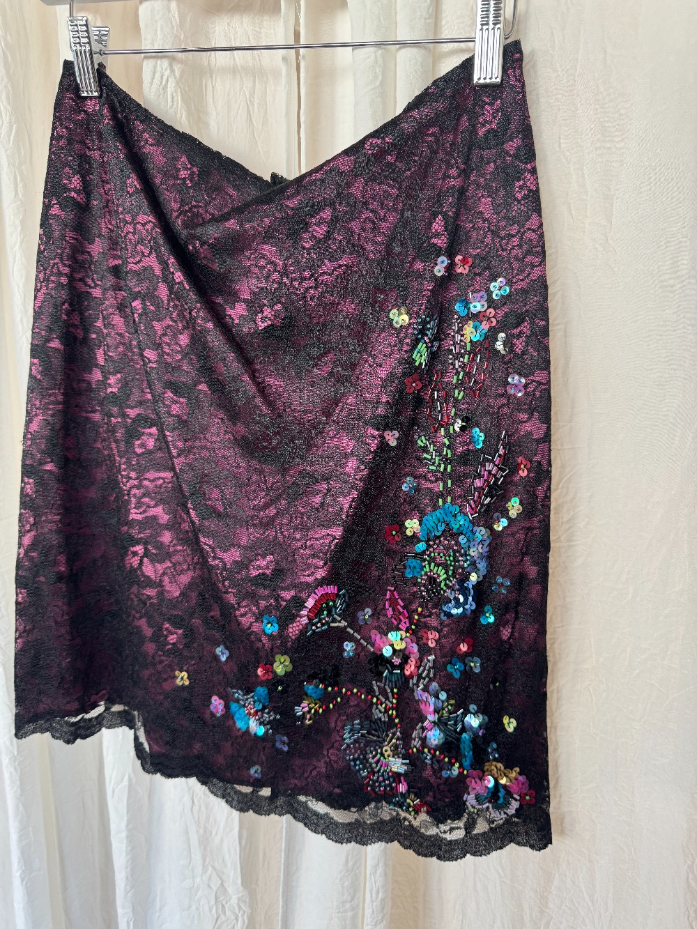 Y2K Muse hot pink midi skirt with black lace overlay and beading and sequin floral design. Non-stretch. Zip-up back.