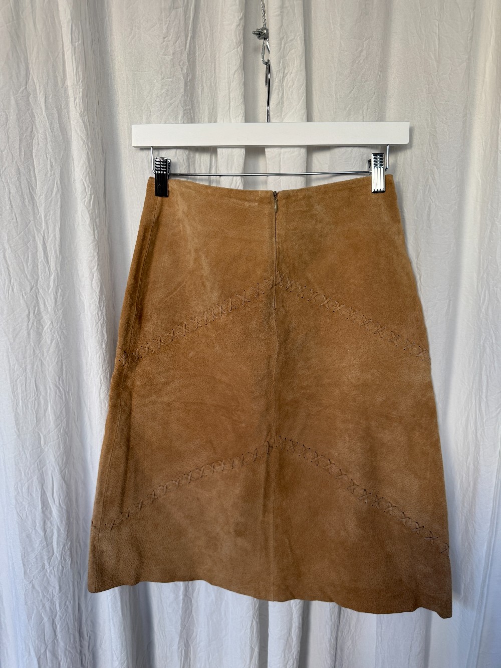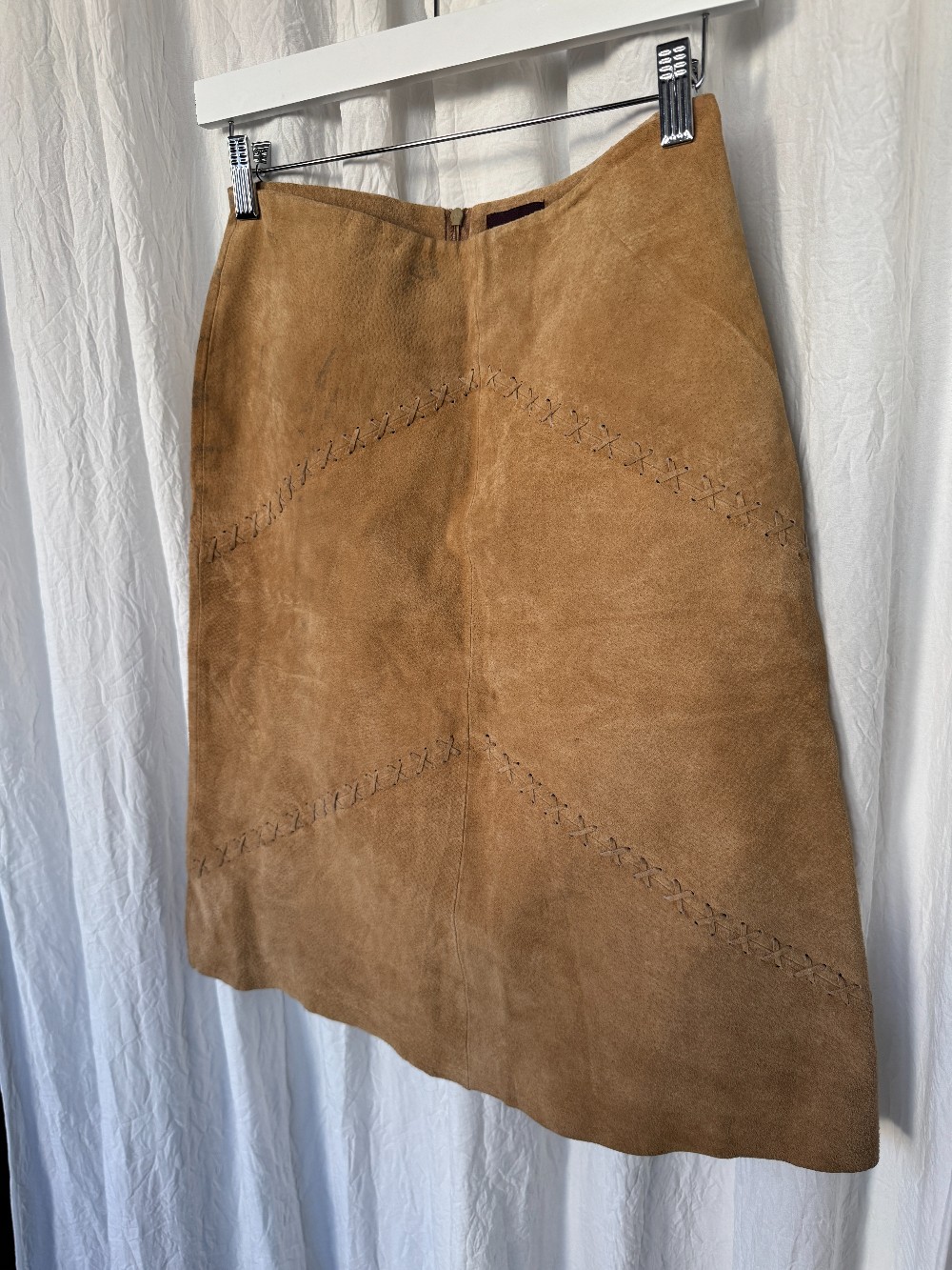 Y2K PRETTY GOOD tan suede leather stitched a-line skirt. fully lined. zip up back. fully lined. non stretch.