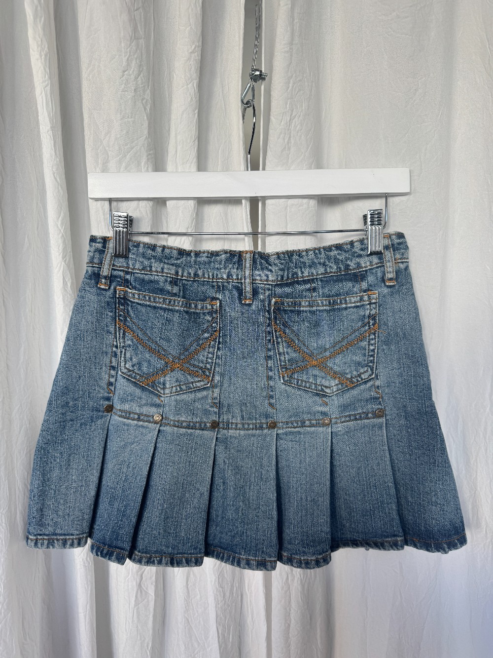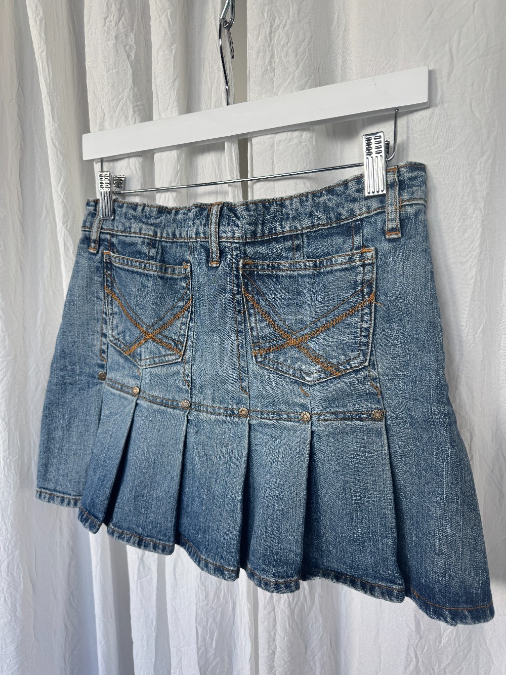 Y2K LOV3E denim pleated back mini skirt. light stretch. a-line style.