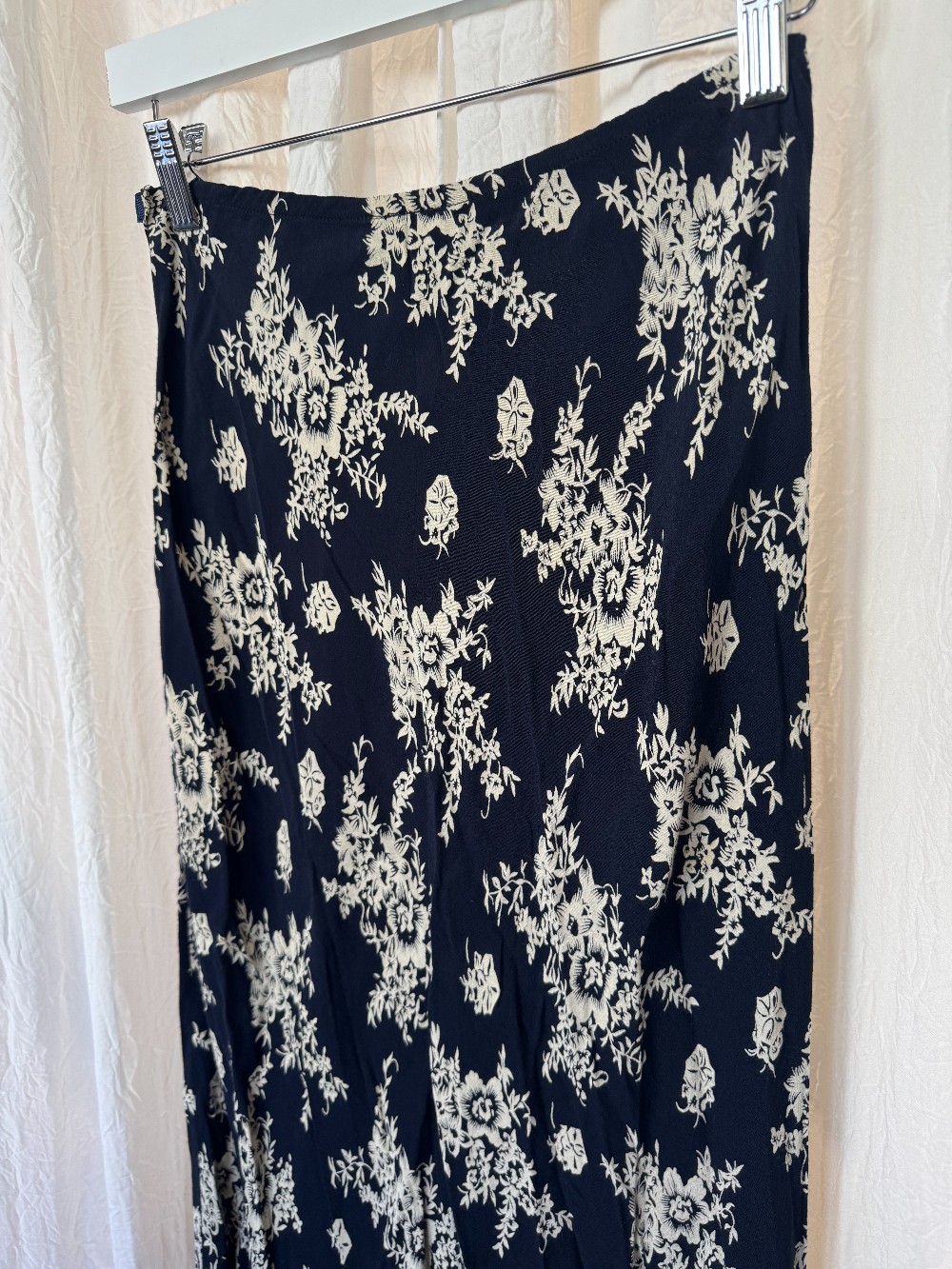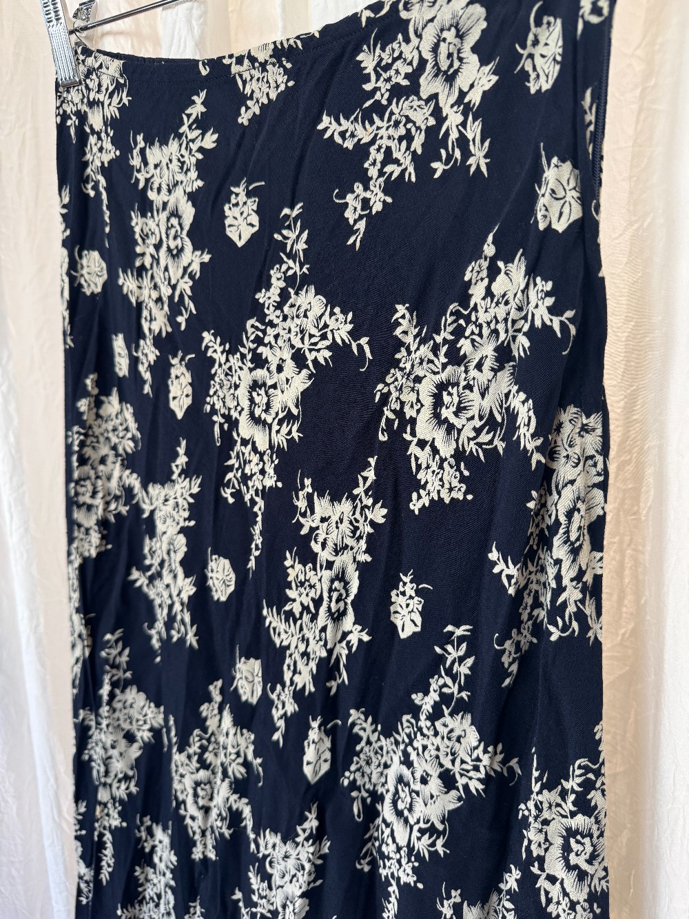 1990s BCBG navy bias cut maxi skirt with white floral pattern.