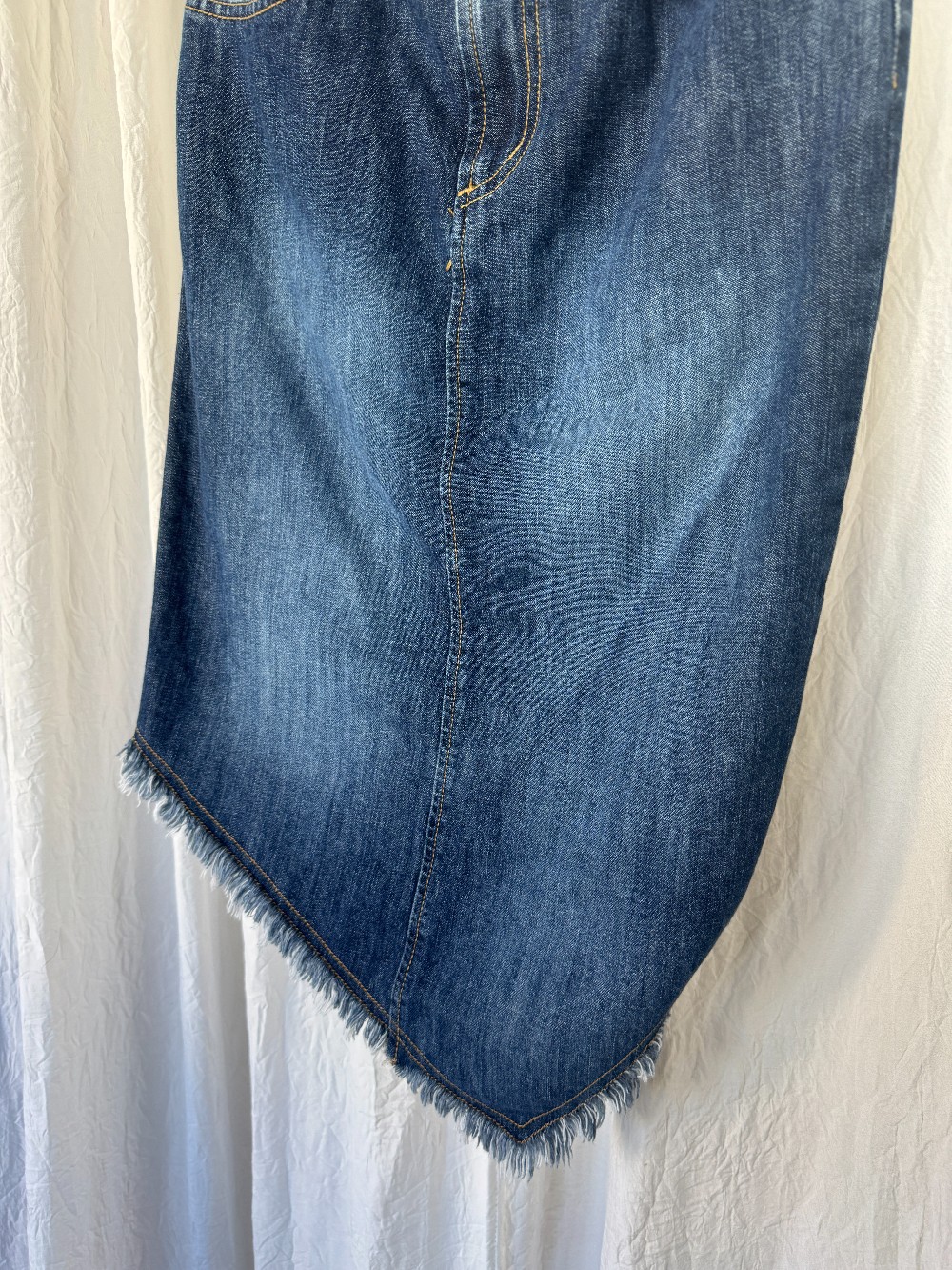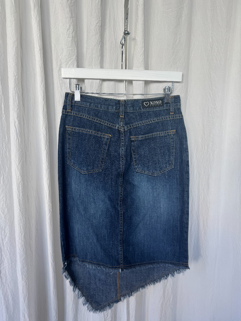 1990s XOXO dark wash denim midi skirt with asymmetrical / handherchief front hem. zip and button fly. non-stretch denim.