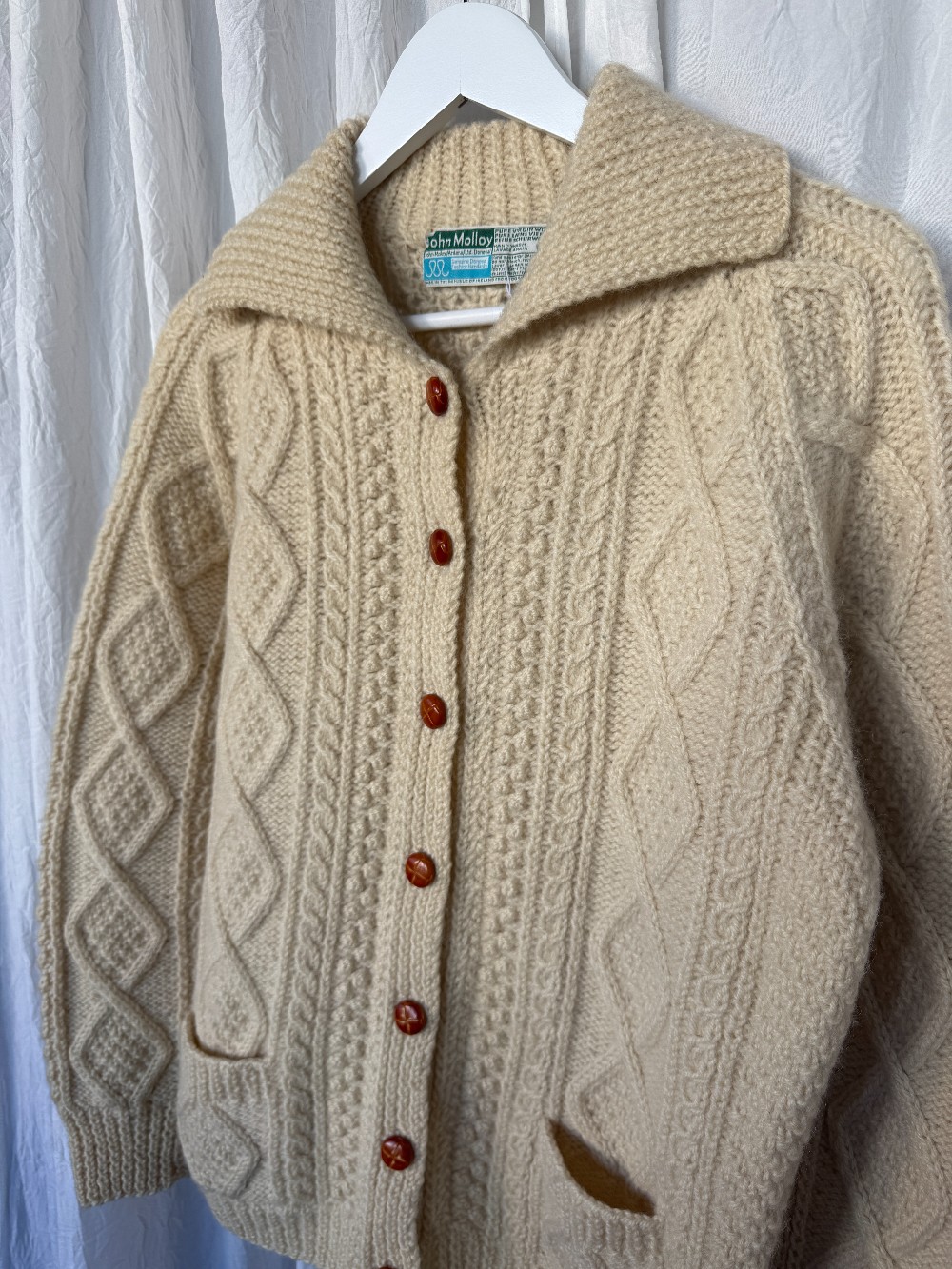 1990s JOHN MOLLOY cream wool fisherman's cardigan. collar. functional buttons down front. made in Ireland. color is way more cream and less beige in person!