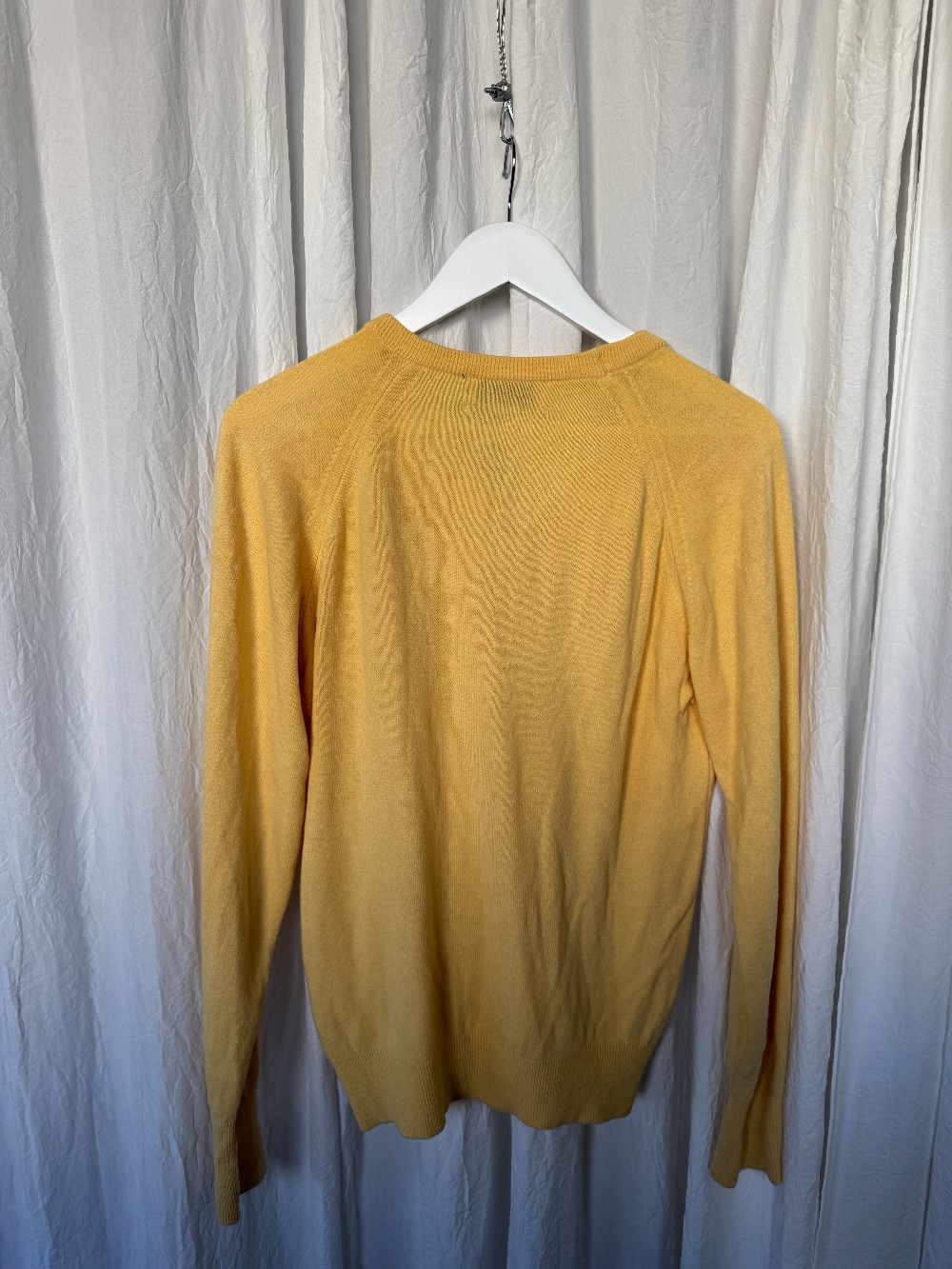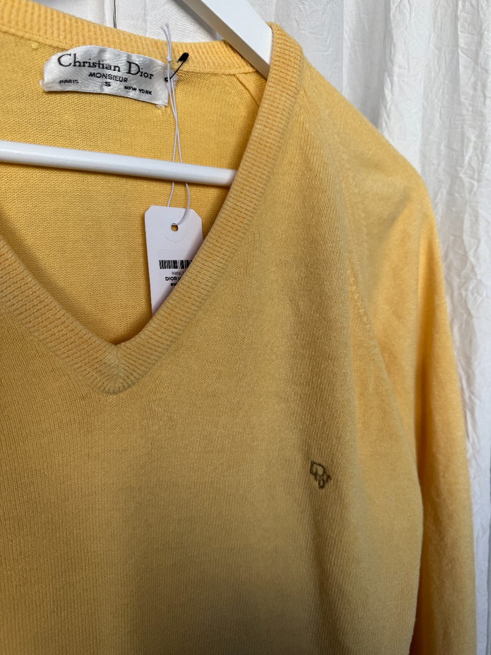 1980s CHRISTIAN DIOR yellow v-neck pullover sweater. long sleeves. small dior logo on chest. more of a softer buttermilk yellow in person!