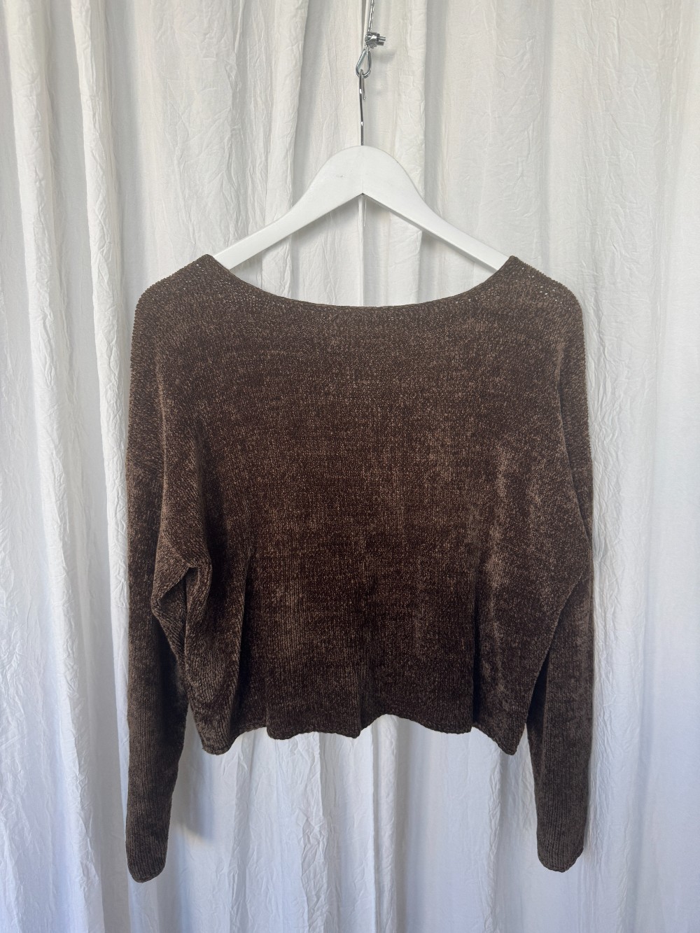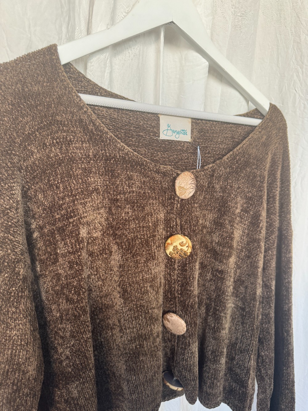 GEORGETTE'S olive green chenille pullover cropped sweater with oversized fabric fixed buttons.