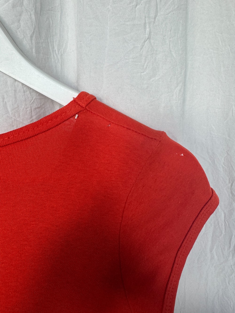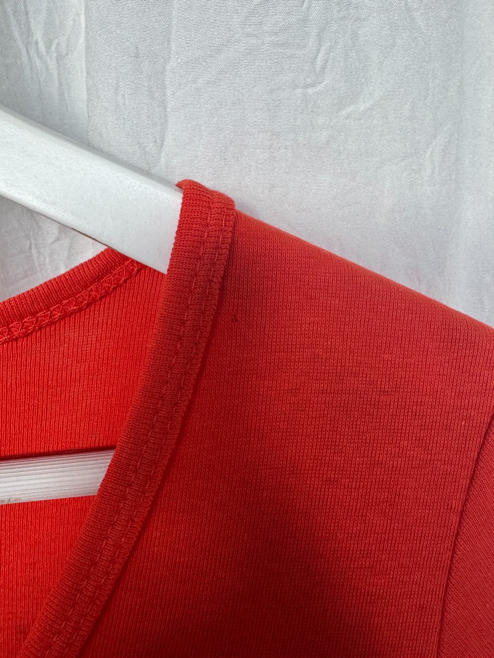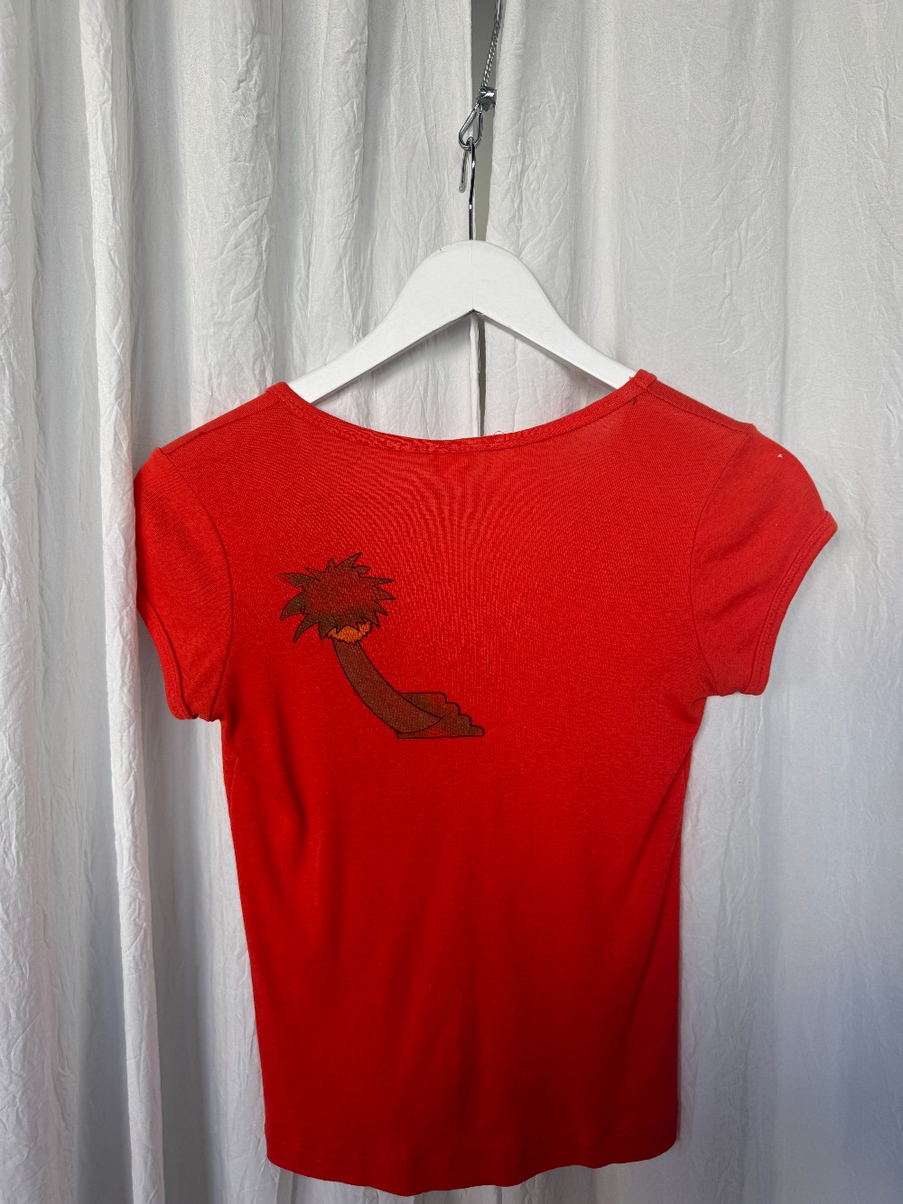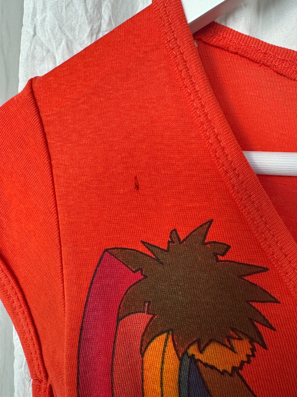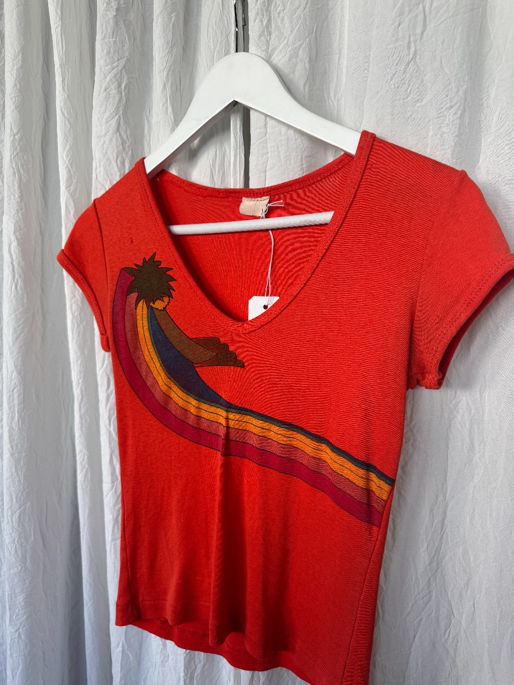 1970s orange baby tee with rainbow and palm tree print. some stretch. color is not as neon in person.