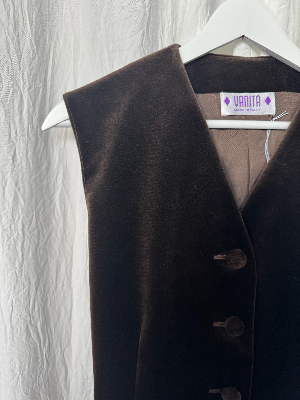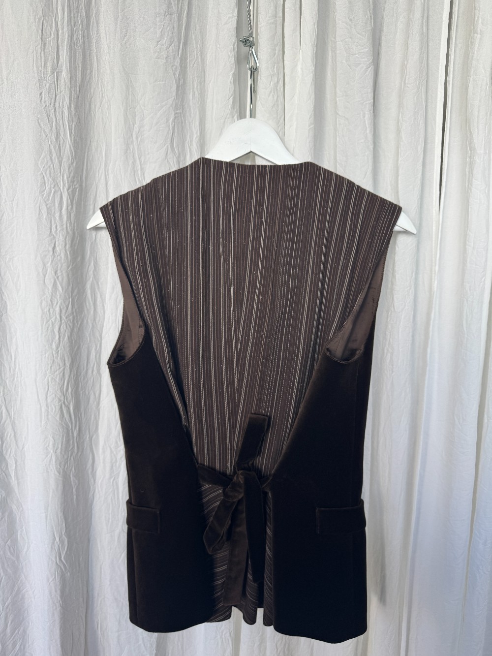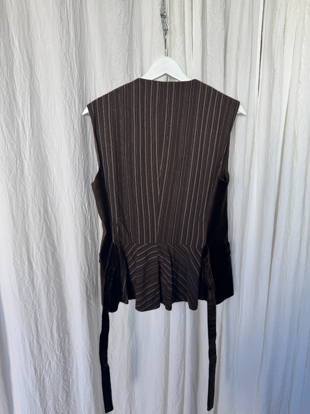1990s VANITA chocolate brown velvet front vest with striped back. tie back. button down front. non-stretch. comes with an extra button. cute ruffle/flutter trim on back!